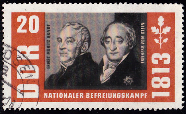 Auf dieser Marke aus der DDR erschien in der Serie "150. Jahrestag der Befreiungskriege" auch eine Marke (MiNr 990), die Ernst Moritz Arndt und Karl Reichsfreiherr vom und zum Stein (1757-1831, preuß. Staatsmann) im Markenbild zeigt.