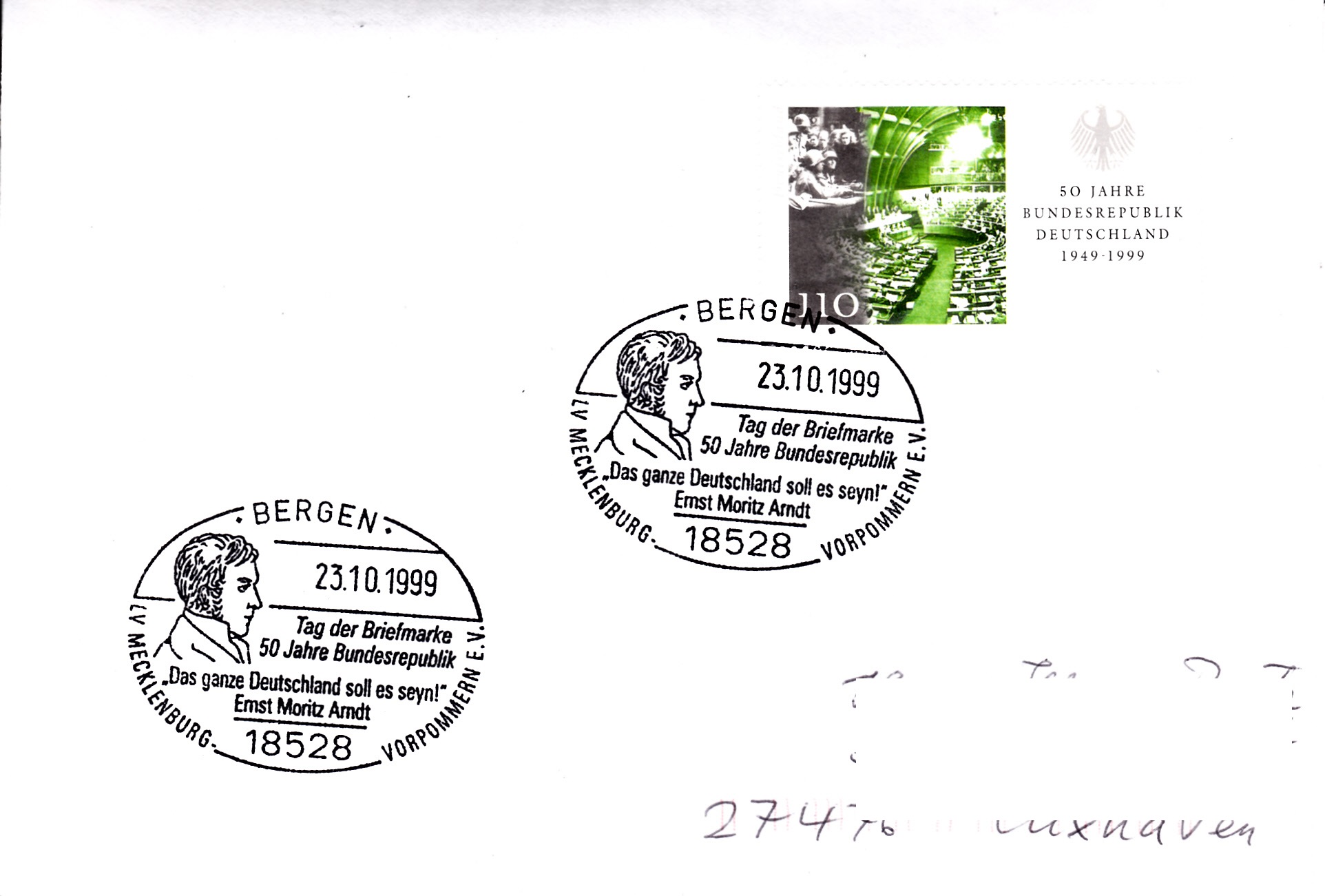 Gelaufener Brief mit dem Sonderstempel vom 23.10.1999 aus Bergen zum Tag der Briemarke. Im Stempelbild werden ein Porträt von Ernst Moritz Arndt und ein Zitat von ihm gezeigt.