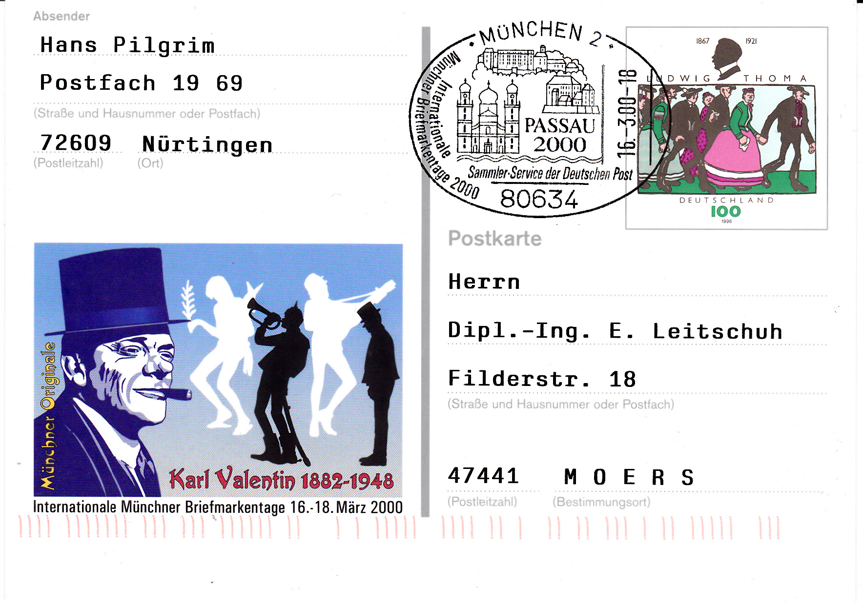 Sonderpostkarte (MiNr PSo 65) zu den Internationalen Münchner Briefmarkentage 2000 mit dem Wertstempel Ludwig Thoma (wie MiNr 1870).