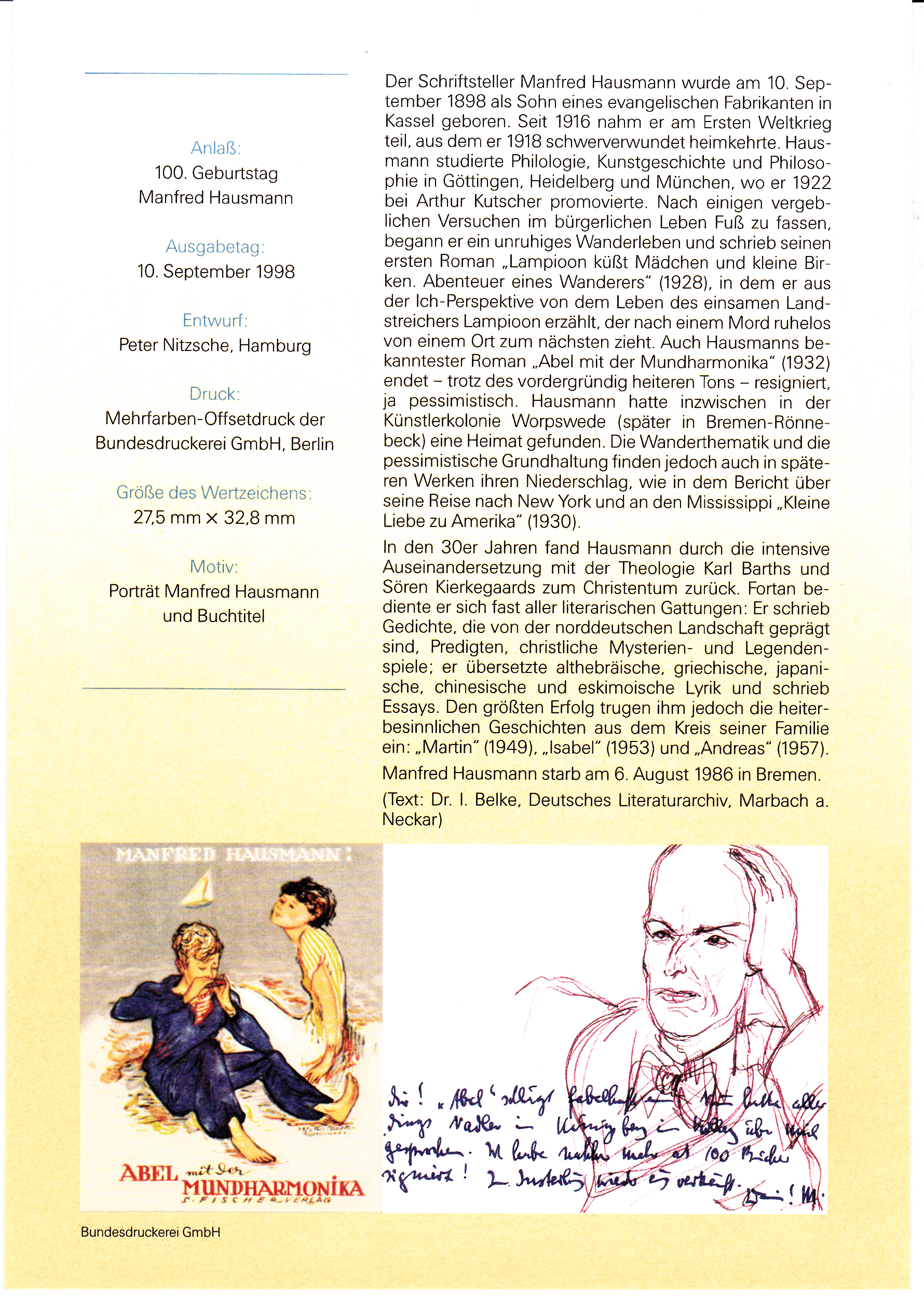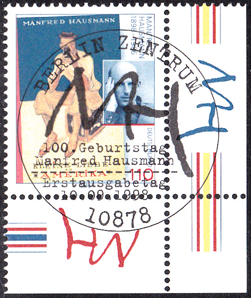 Zum 100. Geburtstag von Manfred Hausmann erschien bei der Deutschen Post eine Sondermarke (MiNr 2012) mit seinem Porträt und einem Buchtitel.