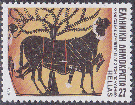"Odysseus flieht aus der Höhle des Polyphem", ein Szene aus der Odyssee, zeigt dieses antike Gefäß auf der Marke zu 27 Drachmen (MiNr 1540).