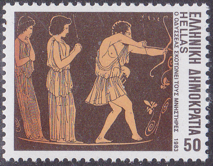 Diese Marke (MiNr 1543) zeigt eine antike Darstellung zu "Odysseus tötet die Freier".