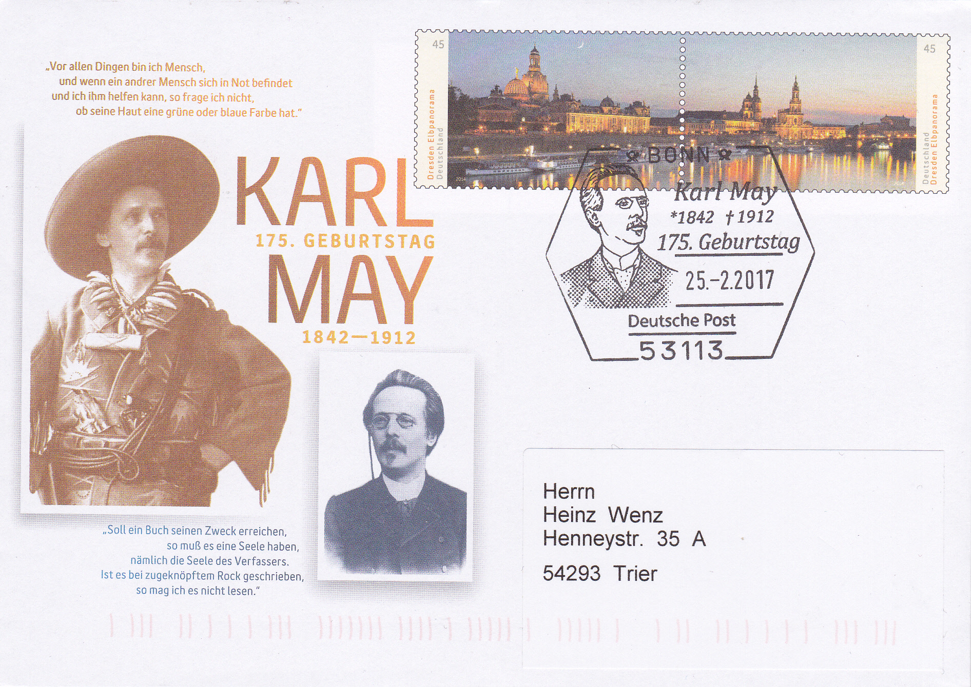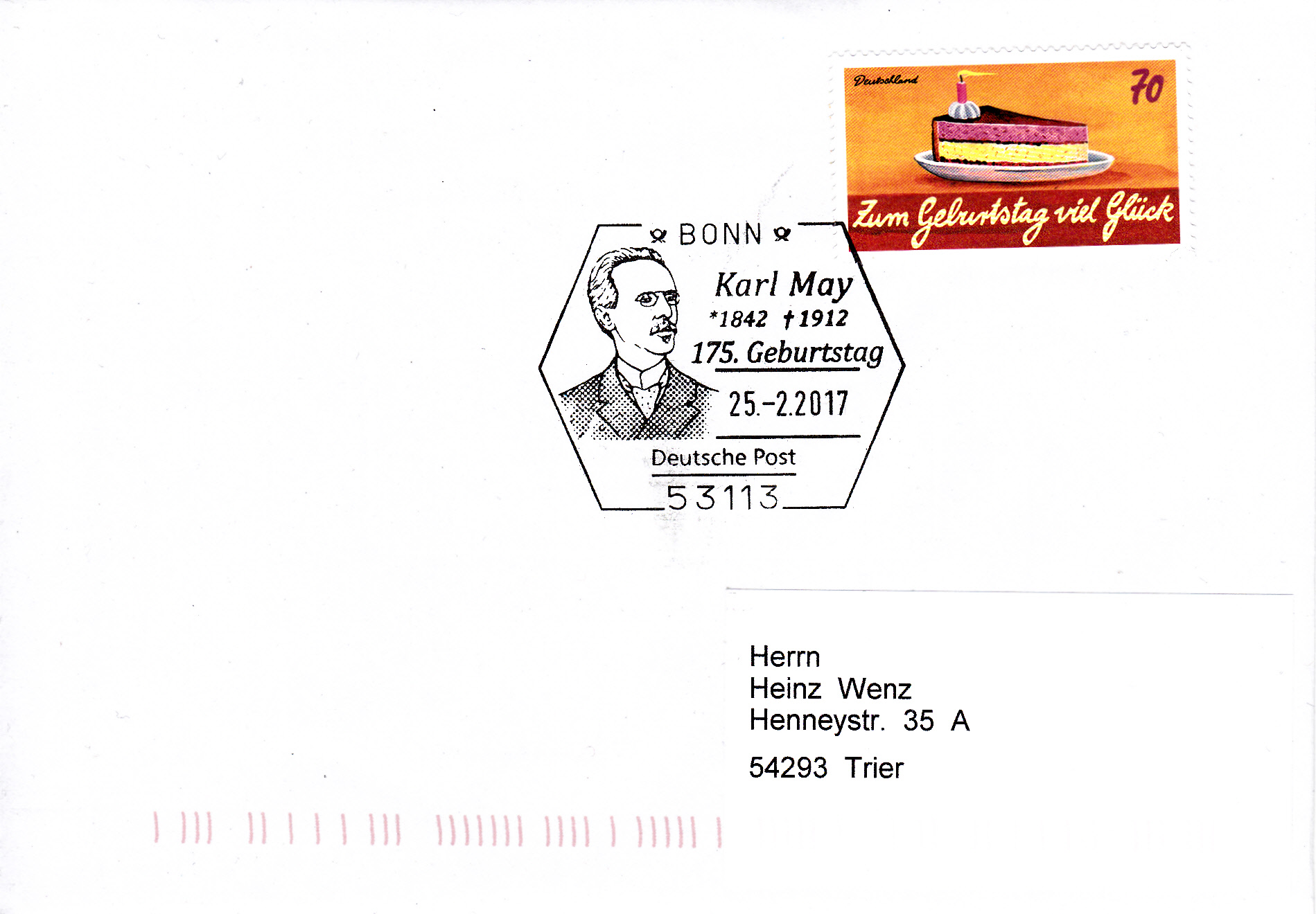 Der bereits gezeigte Sonderstempel vom 25.2.2017 aus Bonn zum 175.Geburtstag von Karl May passt natürlich besser auf den Ganzsachenumschlag zu seinem Geburtstag.