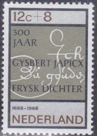 Zum 300. Todestag von Gysbert Japicx erschien in der Serie "Sommermarken" 1966 diese Marke (MiNr 858) mit einem Tintenfass, einem Federkiel und einem Buch als Symbole der Dichtkunst.