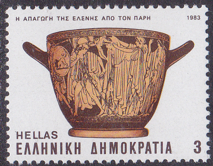 Auf dieser Marke (MiNr 1532) sehen wir ein Gefäß mit der Darstellung "Helenas Entführung durch Paris".