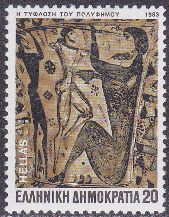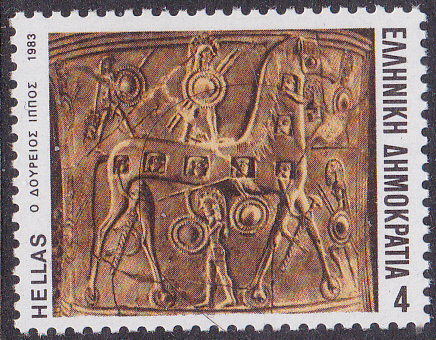 Diese Marke (MiNr 1533) zeigt eine Darstellung des Trojanische Pferdes. Diese Darstellung des Trojanischen Pferdes stammt aus einer kykladischen Reliefamphora aus der Zeit um 670 v. Chr.. Sie ist jetzt im Museum von Mykonos.