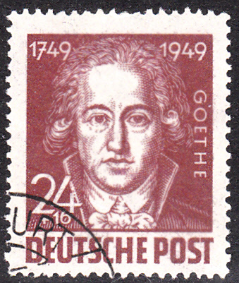 In der Serie "200. Geburtstag von Johann Wolfgang von Goethe" erschien in der Sowjetischen Zone diese Marke (MiNr 235) mit der Abbildung von Goethe in der Campagna nach deinem Gemälde von Johann Heinrich Wilhelm Tischbein (1751 - 1829).