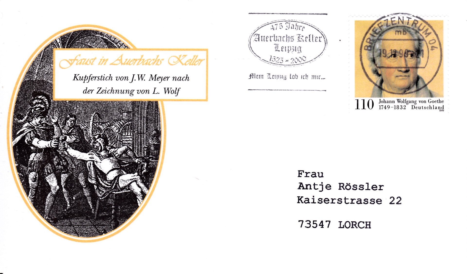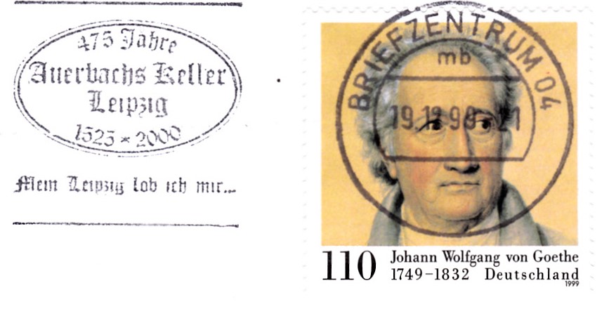 Auch dieser Maschinenwerbestempel vom 19.12.1999 aus dem Briefzentrum 04 mit dem Werbeeinsatz "475 Jahre Auerbachs Keller Leipzig" passt in eine Sammlung Goethe.