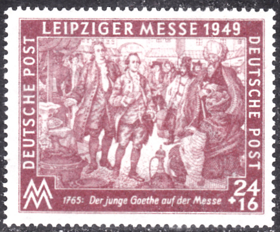 Eine Marke aus der Sowjetischen Besatzungszone (MiNr 241) zu Leipziger Herbstmesse 1949 zeigt den jungen Goethe auf der Messe.