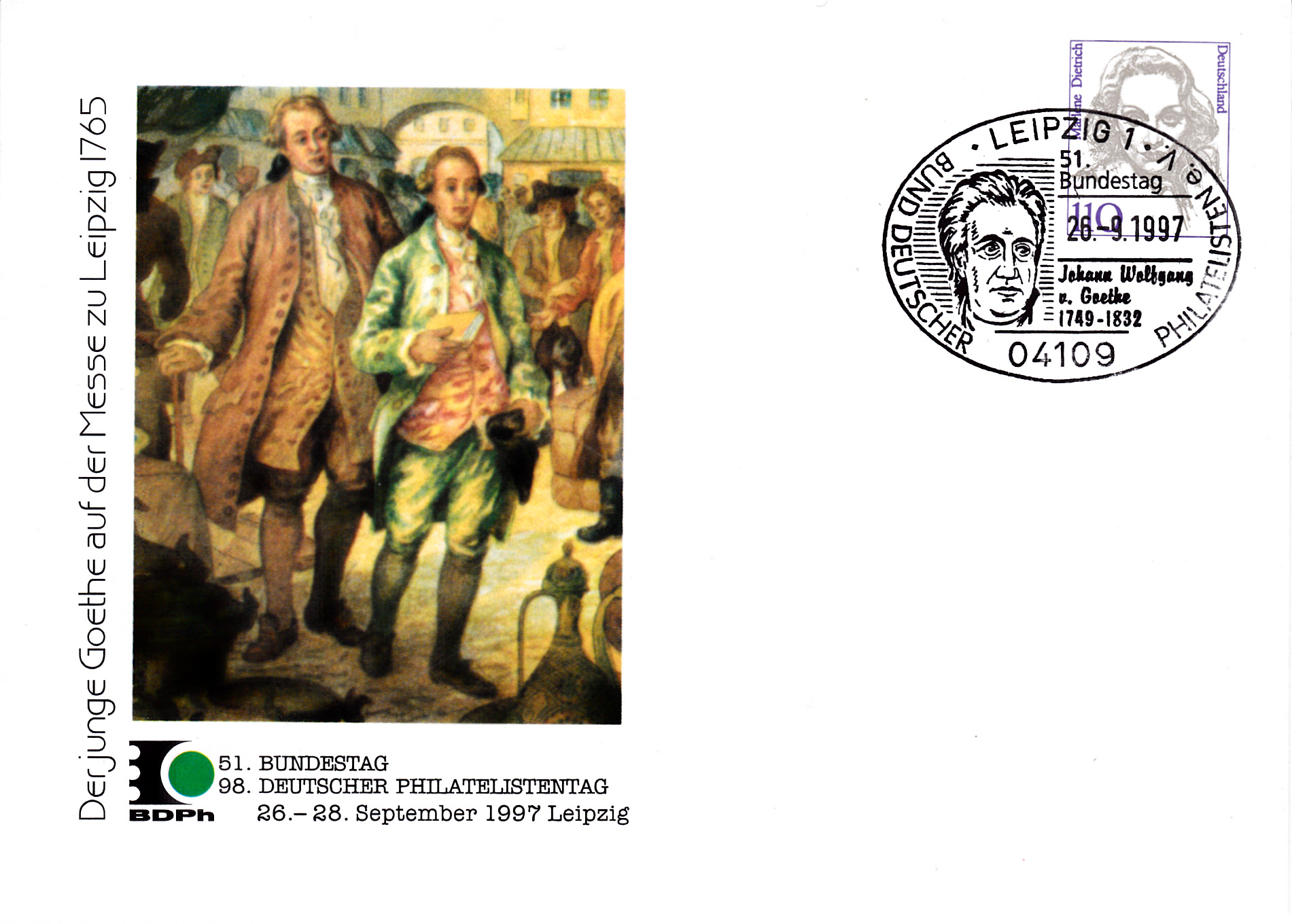 Dieser Ganzsachenumschlag zum 51. Bundestag des BDPh zeigt einen Ausschnitt der Abbildung auf der Marke im vorhergehenden Beitrag. Sie wurde mit dem passenden Sonderstempel aus Leipzig vom 26.9.1997 mit einem Porträt von Goethe gestempelt.