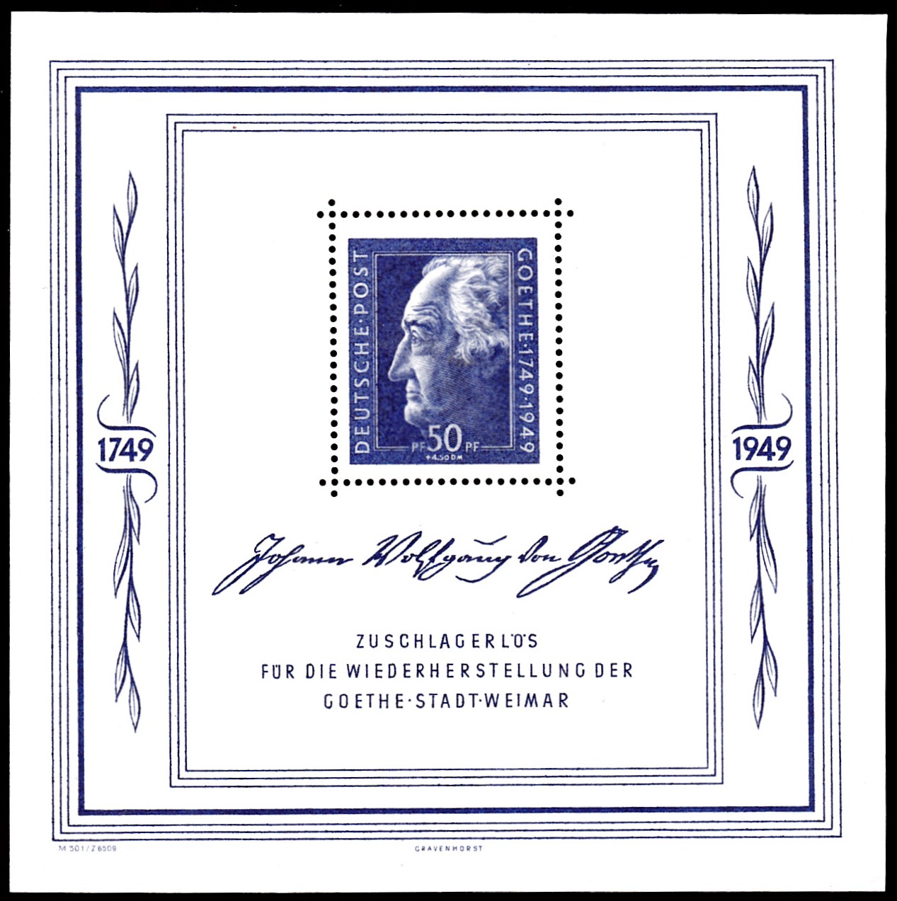 In der Sowjetischen Besatzungszone ist zu den Goethe-Festwochen in Weimar ein Block (MiNrn Block6 mit Marke MiNr 239) erschienen. Auf der Marke wird Johann Wolfgang von Goethe nach einem Kreideporträt von Julius Sebbers (1804-1837) gezeigt. Bei diesem Block ist nur die Marke gummiert.