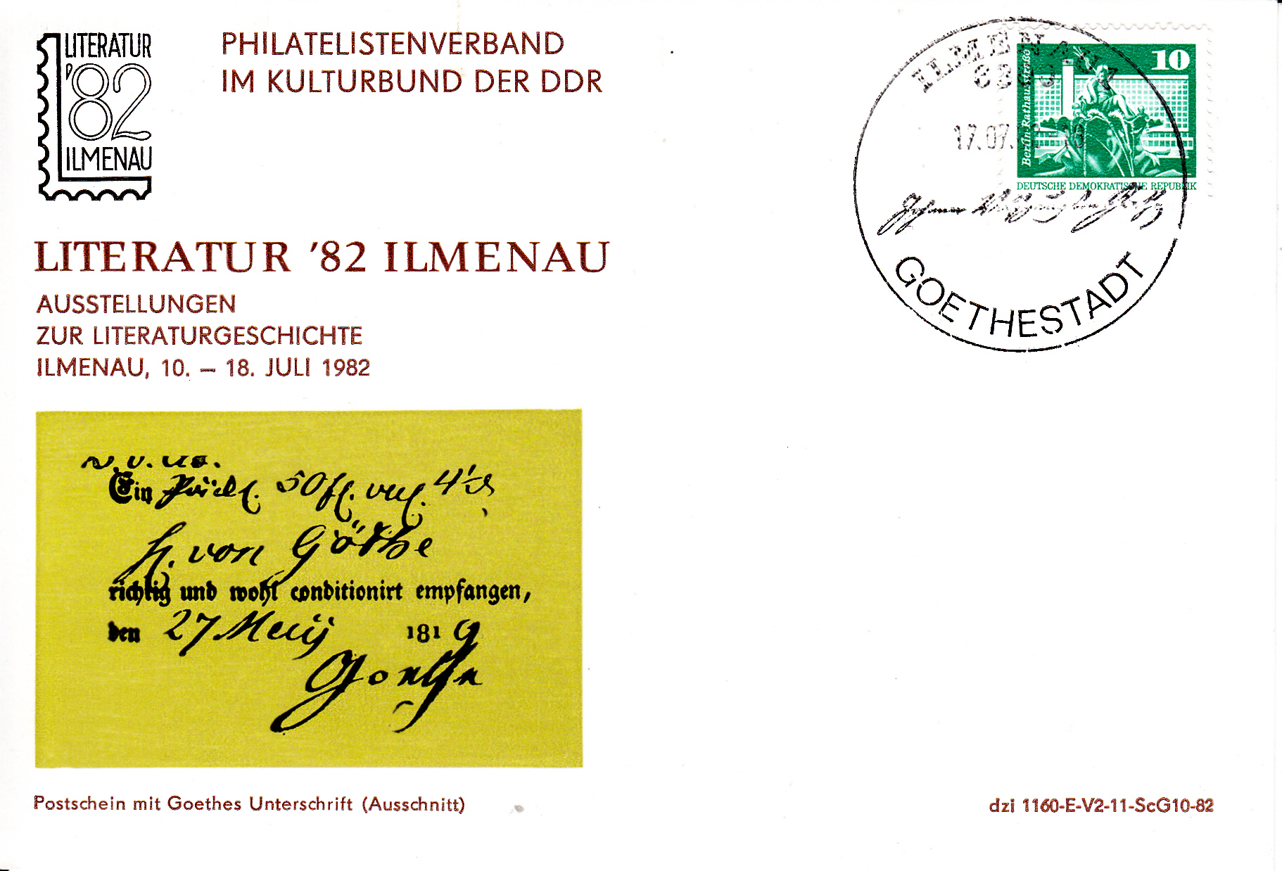 Karte, leider nicht gelaufen, mit einem Sonderstempel aus Ilmenau vom 17.7.1982 mit einer Unterschrift von Goethe und dem Zusatz "Goethestadt".