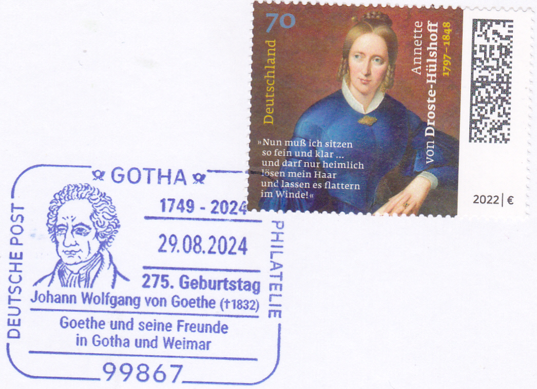 Sonderstempel vom 29.8.2024 aus Gotha zum 275. Geburtstag von Johann Wolfgang von Goethe.