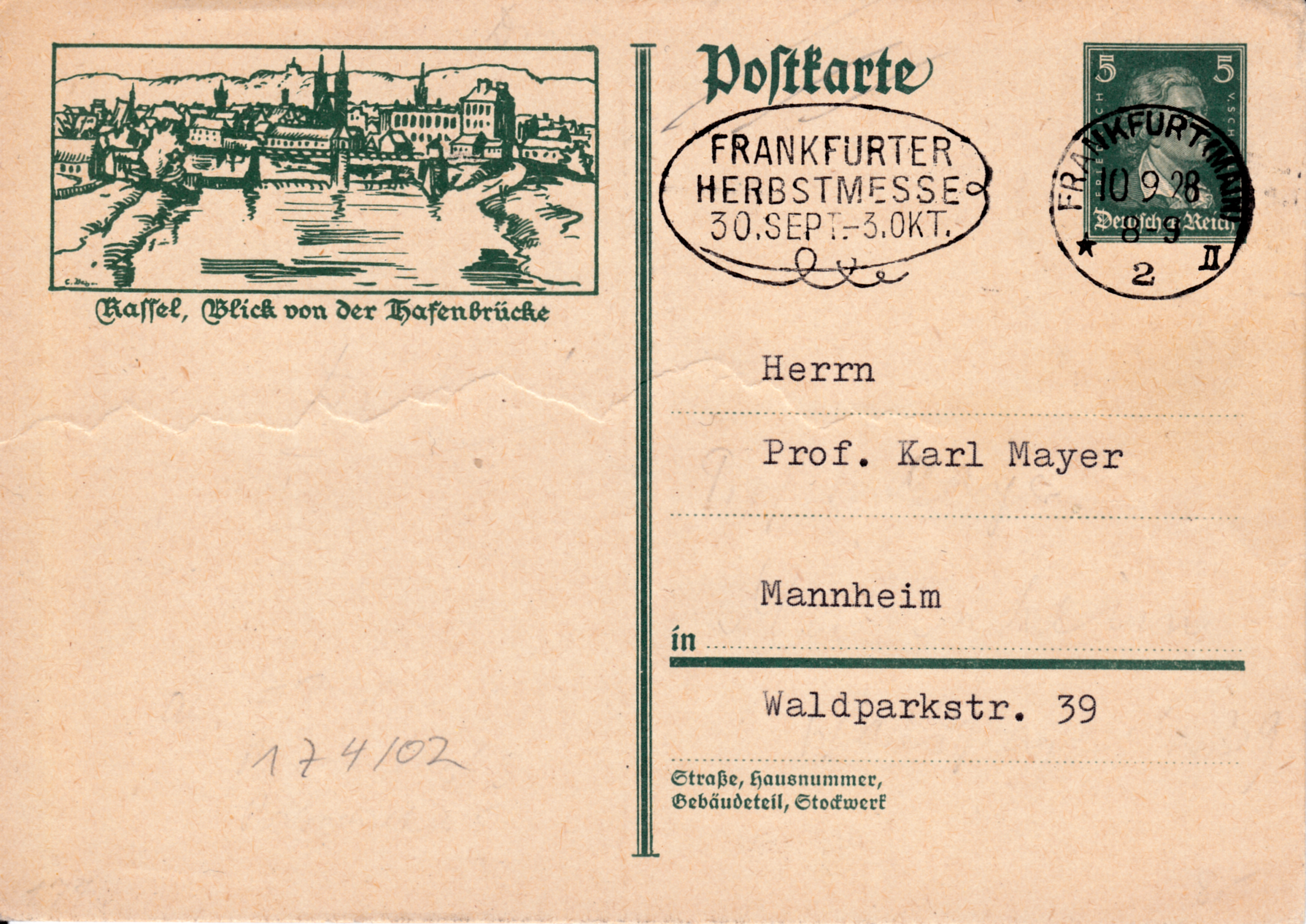Die Bildpostkarten 1927 (MiNr P 174) mit dem Wertstempel "Berühmte Deutsche" mit dem Porträt von Friedrich von Schiller ist mit insgesamt 10 verschiedenen Bildern erschienen. Hier zeige ich die Karte MiNr P 174/02 mit einer Abbildung aus Kassel.