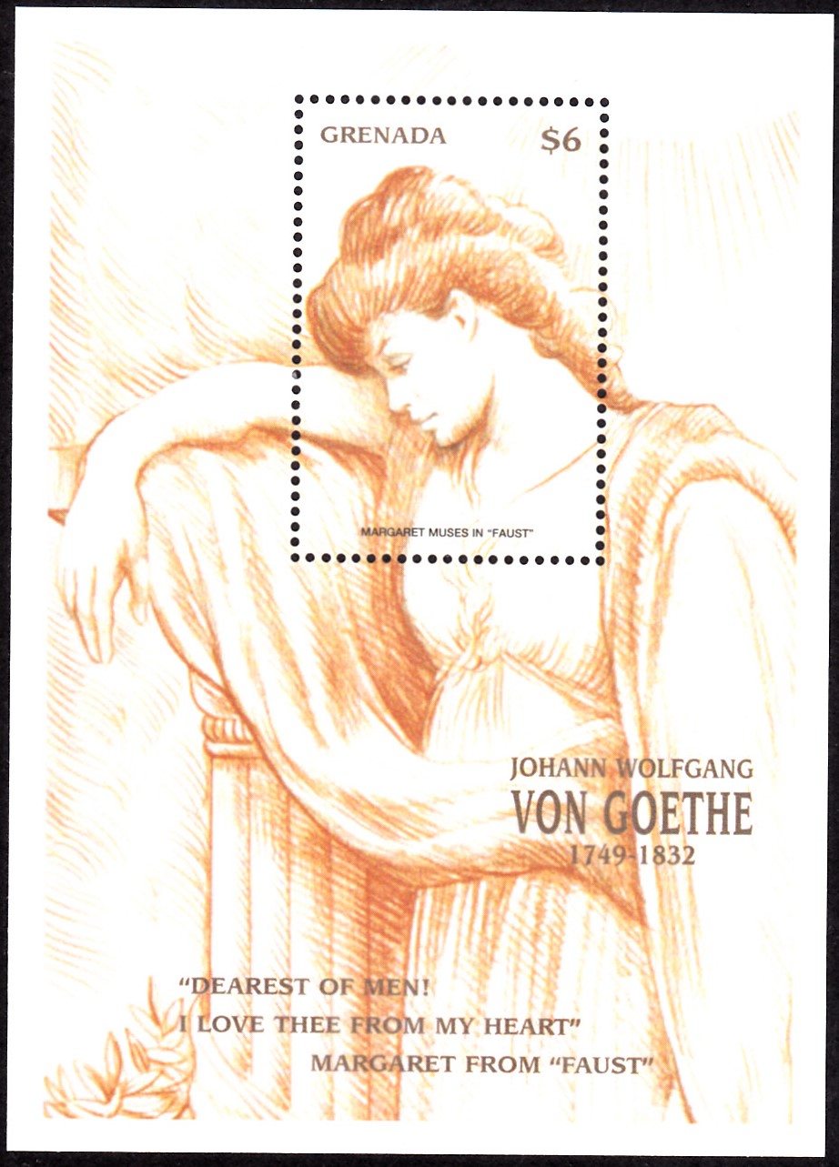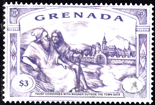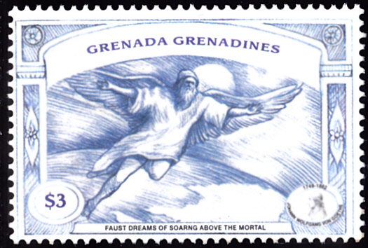 Zum 250. Geburtstag von Johann Wolfgang von Goethe erschien in Grenada in einer Serie diese Marke (MiNr 3964) mit der Darstellung "Faust in Betrachtung des Mondes".