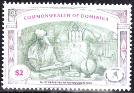 Auch in Dominica ist zum 250. Geburtstag von Johann Wolfgang von Goethe eine Markenserie mit Darstellungen zum "Faust" erschienen. Eine Marke (MiNr 2715) zeigt eine Darstellung zu "Faust in seinem Labor".