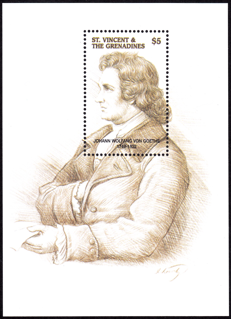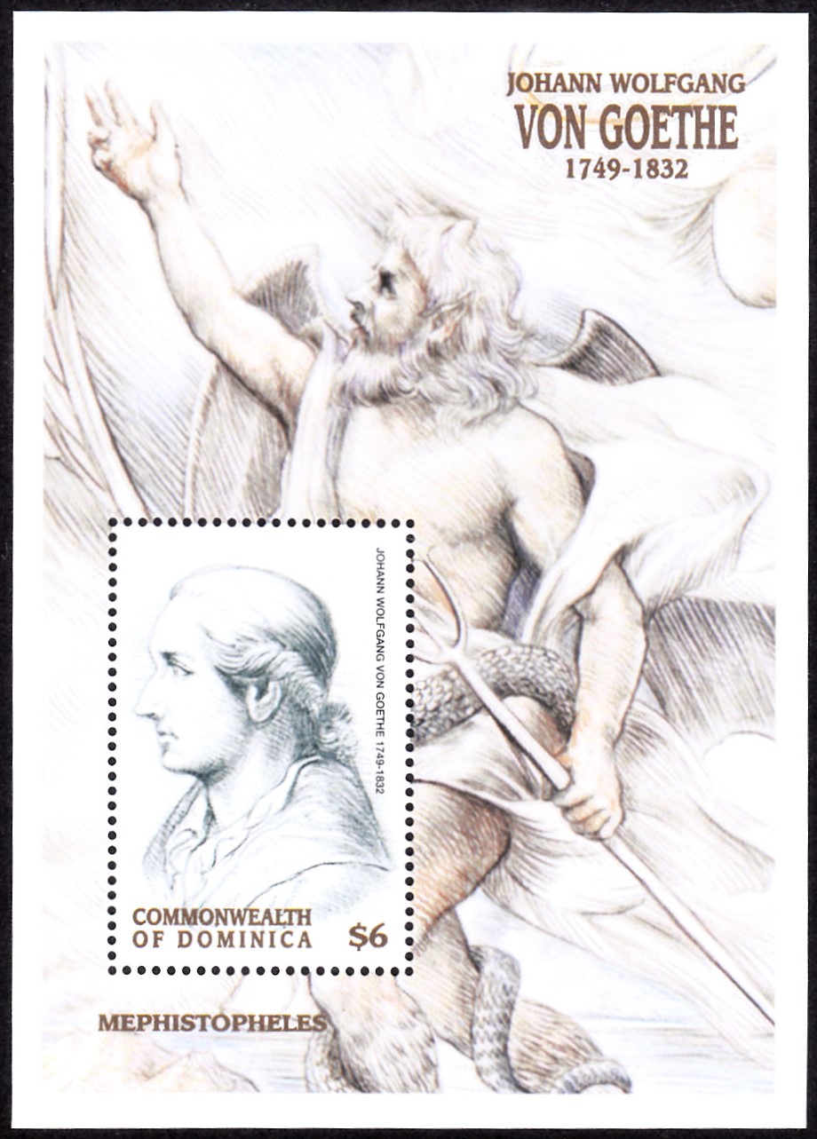 Zur Ausgabe aus Dominica gehört auch wieder ein Block (MiNr Block 384 mit Marke MiNr 2718). Auf der Marke ist Goethe als junger Mann zu sehen.