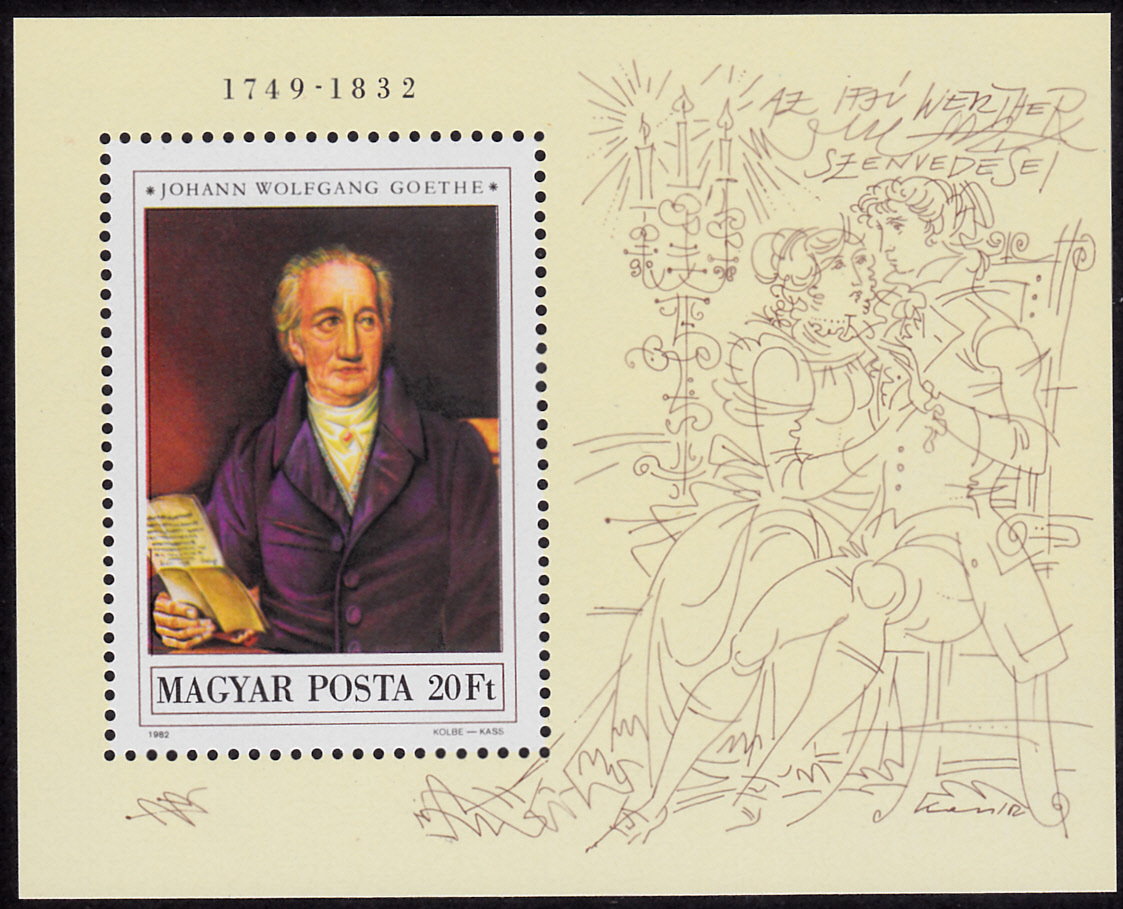 Zum 150. Todestag von Johann Wolfgang von Goethe gab es in Ungarn eine Marke (MiNr 3595 A) in einem Block (MiNr Block 161 A) mit der Abbildung von Johann Wolfgang von Goethe nach einem Gemälde von Joseph Karl Stieler (1781 - 1858, deutscher Maler).