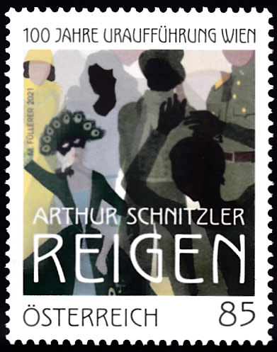 Diese Marke aus Österreich (MiNr 3612) zum 100. Jahrestag der Uraufführung des Theaterstücks "Der Reigen" zeigt eine Szene aus dem Schauspiel "Der Reigen" von Arthur Schnitzler.