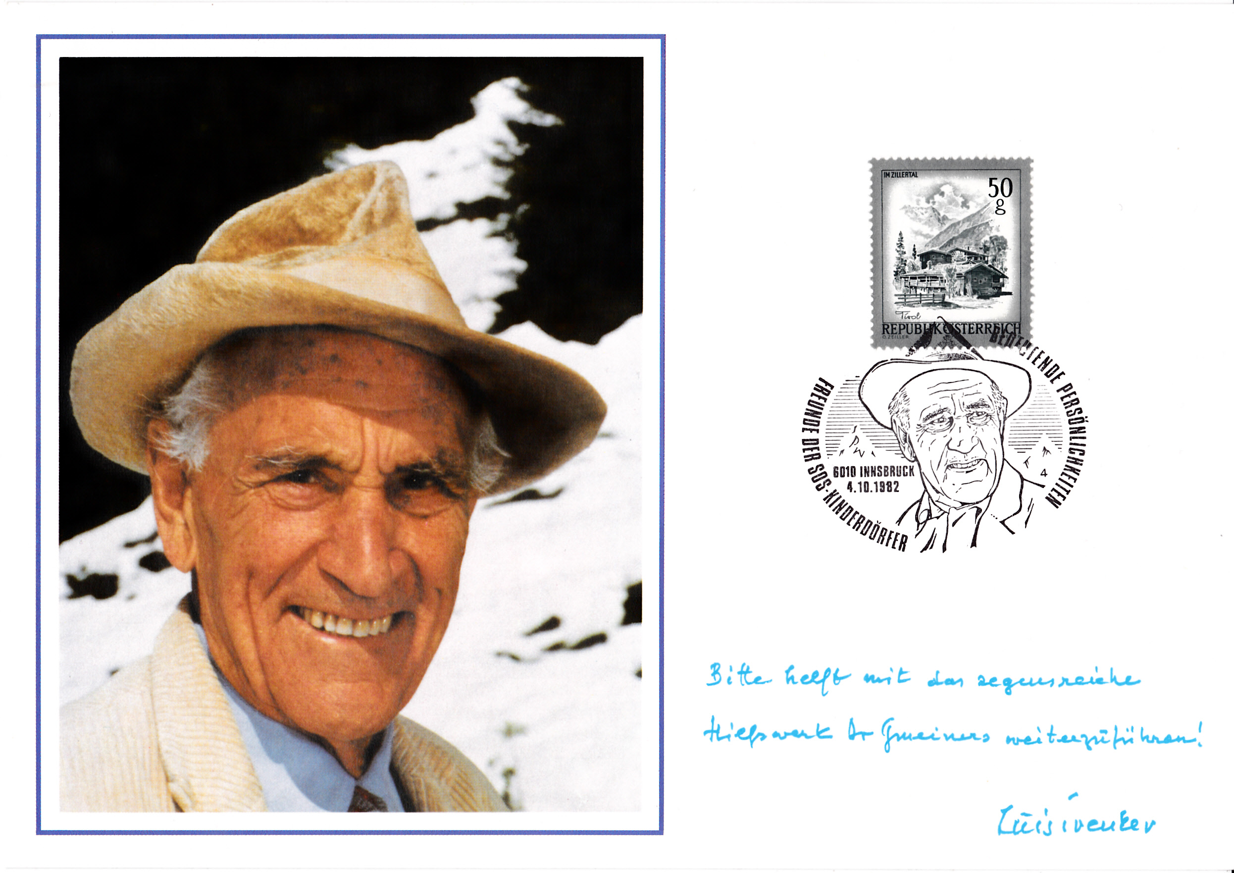 In Insbruck wurde für eine Aktion der SOS-Kinderdörfer am 4.10.1982 ein Sonderstempel mit einem Porträt von Luis Trenker verwendet. Dazu gab es etwas Kartonphilatelie, die zu Gunsten der SOS-Kinderdörfer vermarktet wurde. Der gezeigte Stempel hat die Kennziffer "4".