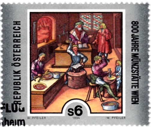 Eine Marke aus Österreich (MiNr 2119) zeigt die "Münzschläger", eine lllustration zu "Weißkunig", einbem unvollendeten Roman des Kaisers Maximilian I..