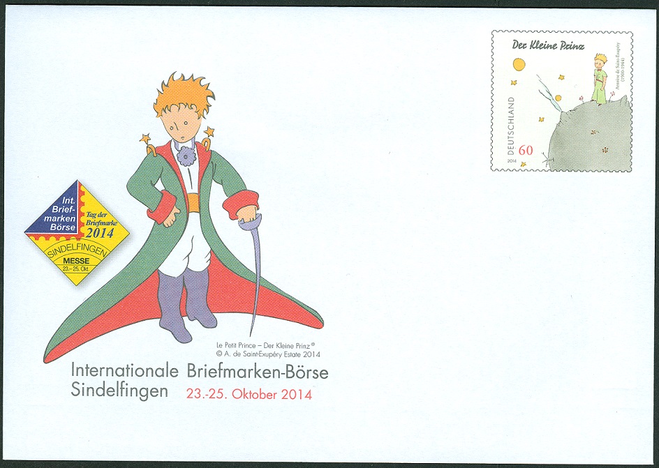 Ersttagsbrief mit Ersttagsonderstempel Bonn vom 1.9.2014. Im Motiv des ESST sehen wir das Motiv "Der kleine Prinz kümmert sich um seine Rose".