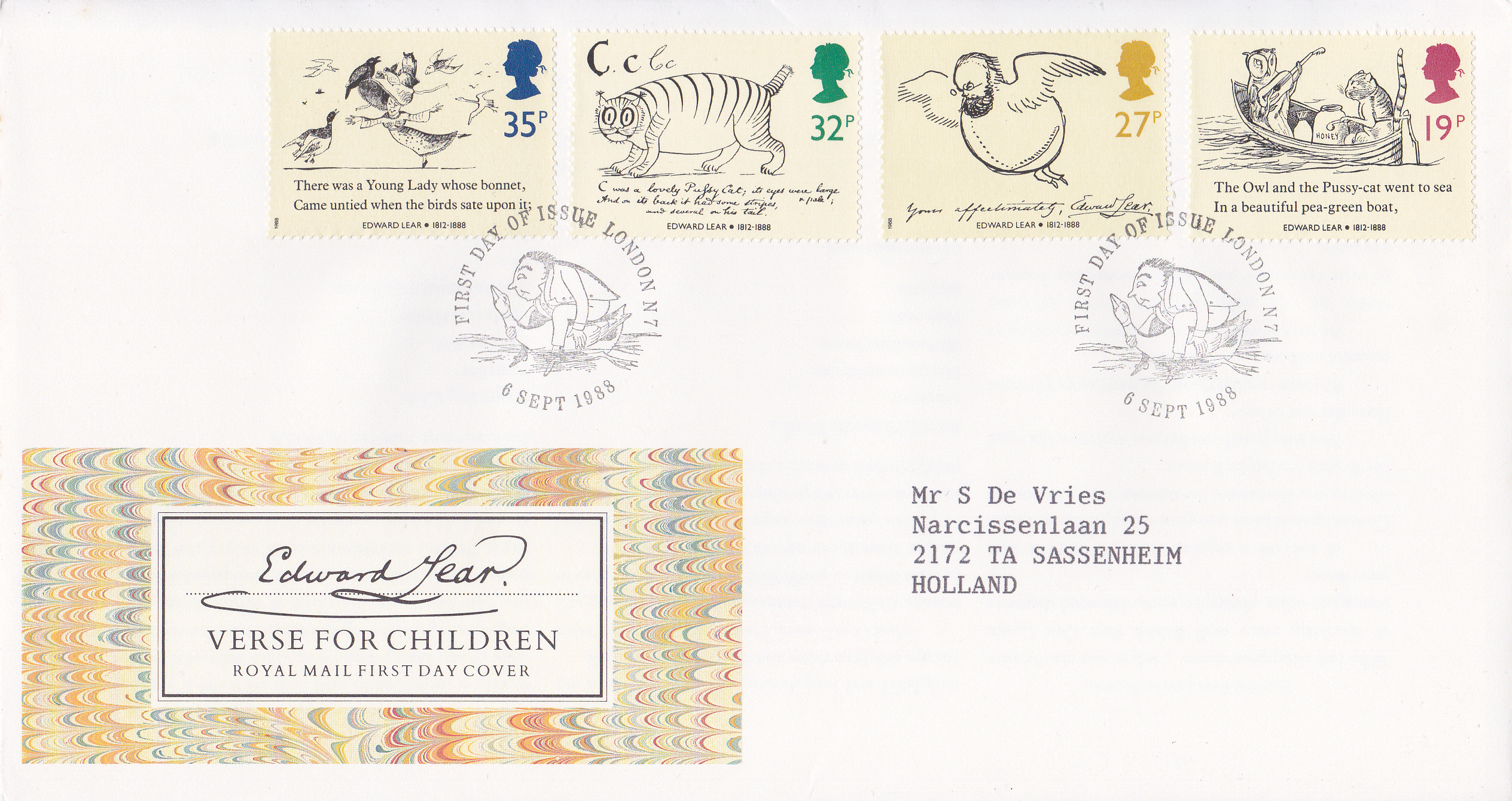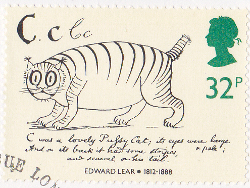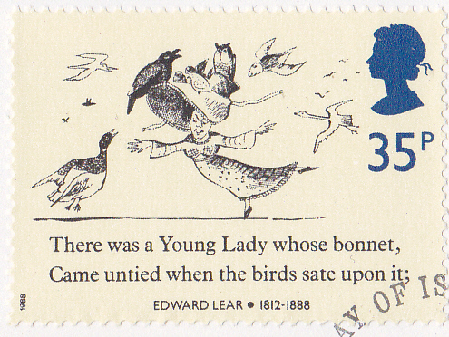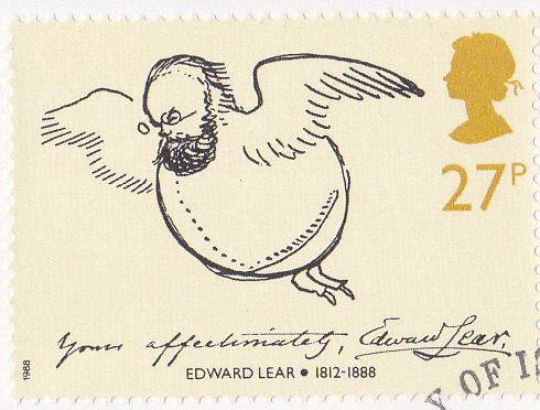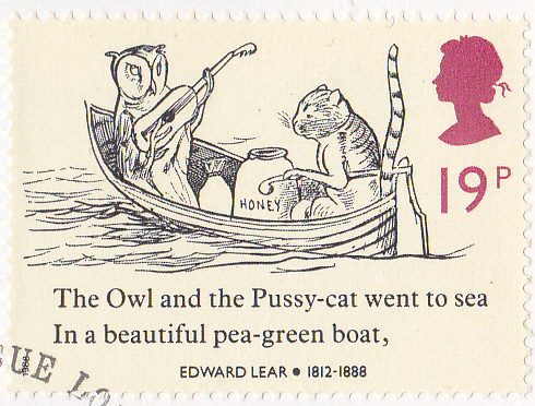 Zum 100. Todestag von Edward Lear ist in einer Serie in Großbritannien diese Marke (MiNr 1170) mit einer Illustration aus dem Kinderbuch "Die Eule und die Katze" erschienen.