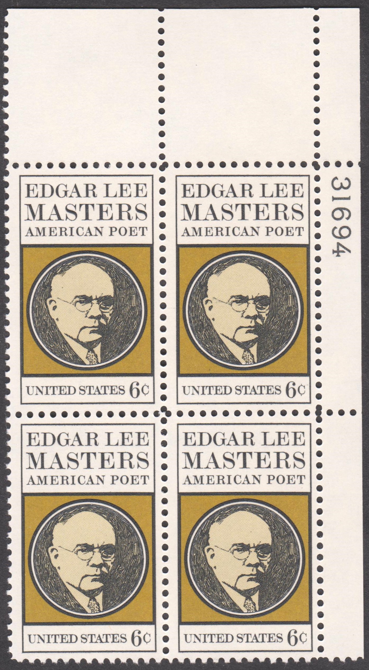 USA MiNr. 1007 als Eckranmdviererblock oben rechts mit Bogenzählnummer "31694" im rechten Seitenrand