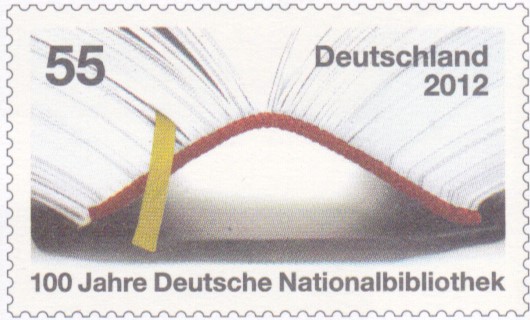 Zum Jubiläum 100 Jahre Deutsche Nationalbibliothek ist eine Marke (MiNr 29565) mit einem aufgeschlagenen Buch erschienen.