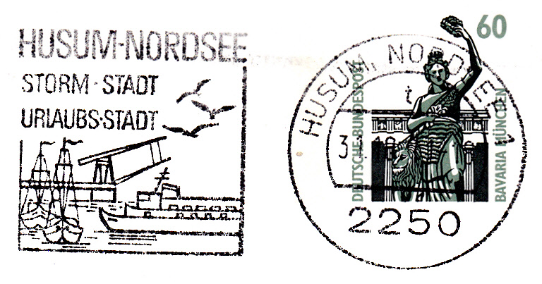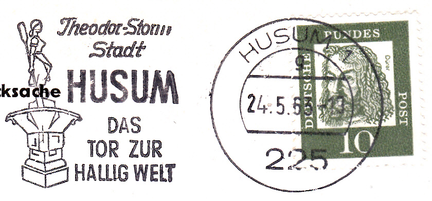 Dieser Maschinenwerbestempel aus Husum, Nordsee 1 enthält im Text "Husum-Nordsee / Storm-Stadt / Urlaubsstadt" wieder einen Hinweis auf die Geburtsstadt von Theodor Storm.