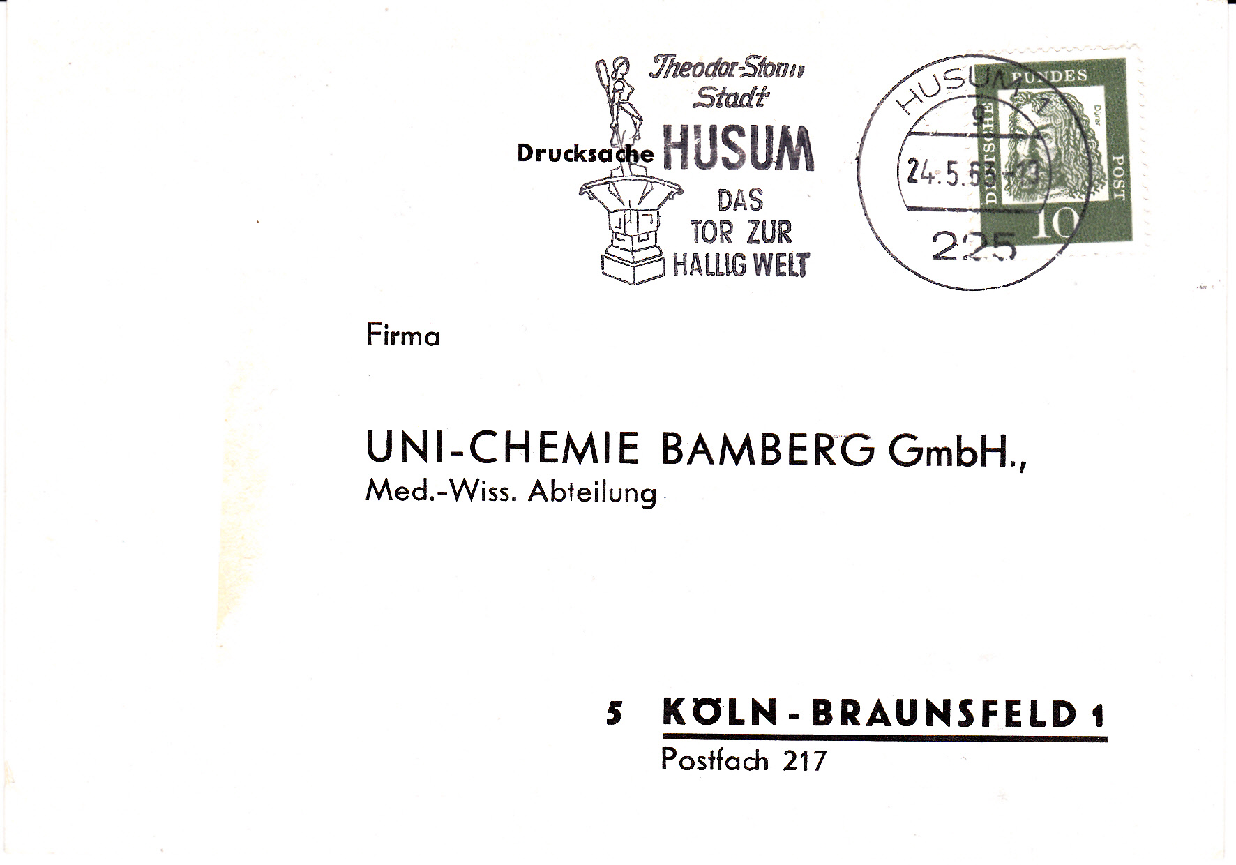 Maschinenwerbestempel vom 24.5.1963 aus Husum. Im Werbeeinsatz befindet sich der Hinweis "Theodor-Storm Stadt".