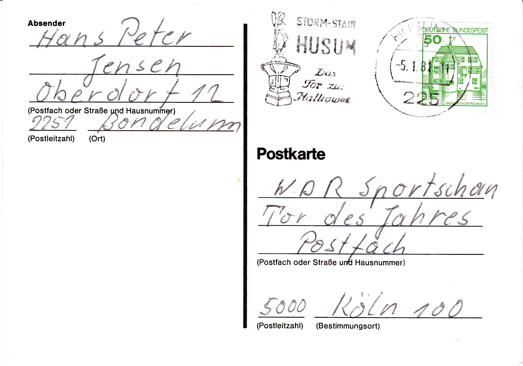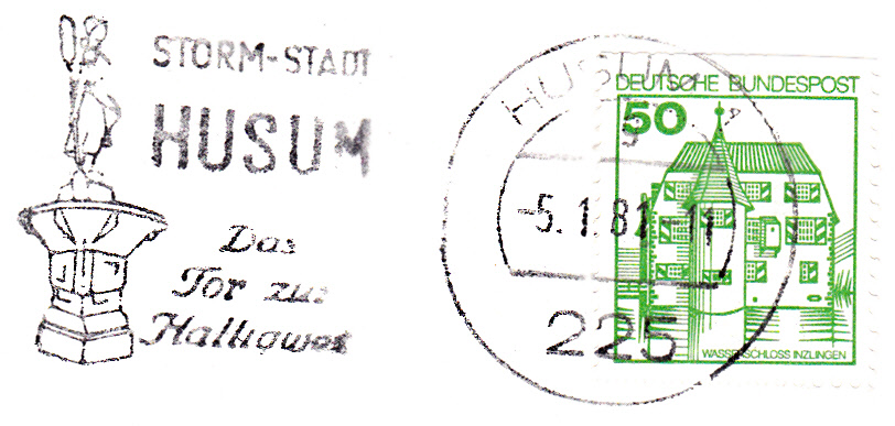 Hier ein etwas späterer Maschinenwerbestempel vom 5.1.1981 aus Husum. Im Werbeeinsatz befindet sich der Hinweis "Storm-Stadt". Das Motiv mit der Bronzefigur des Asmussen-Woldsen-Denkmals ("Tine-Brunnen") ist gleich geblieben.