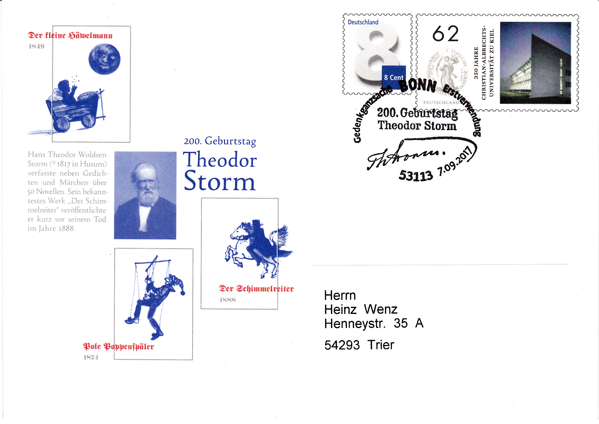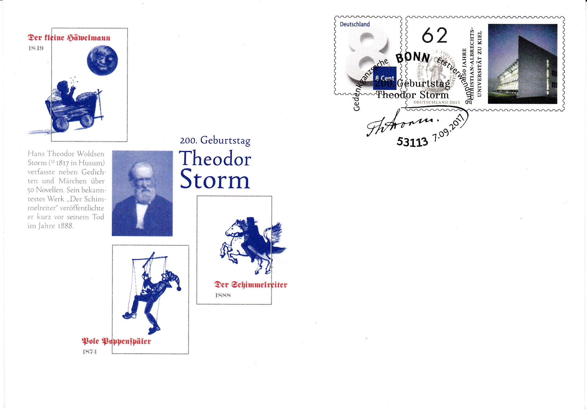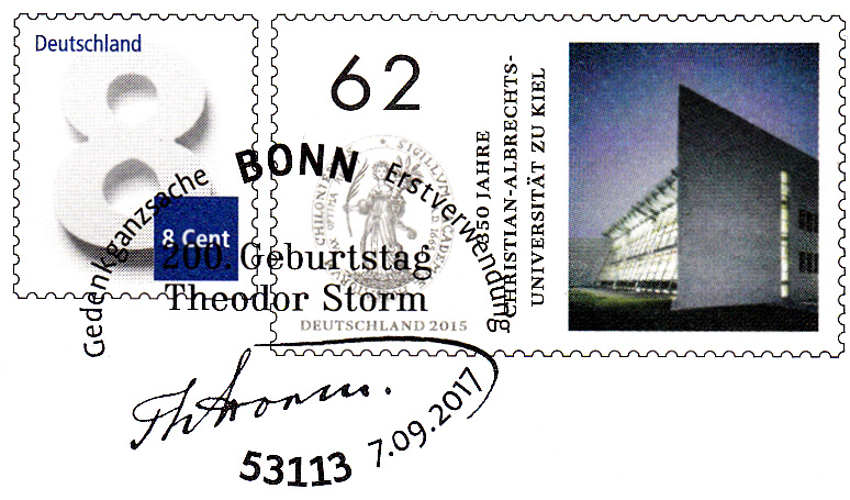Sonderstempel vom 14.9.2017 aus Husum zum 200. Geburtstag von Theodor Storm.