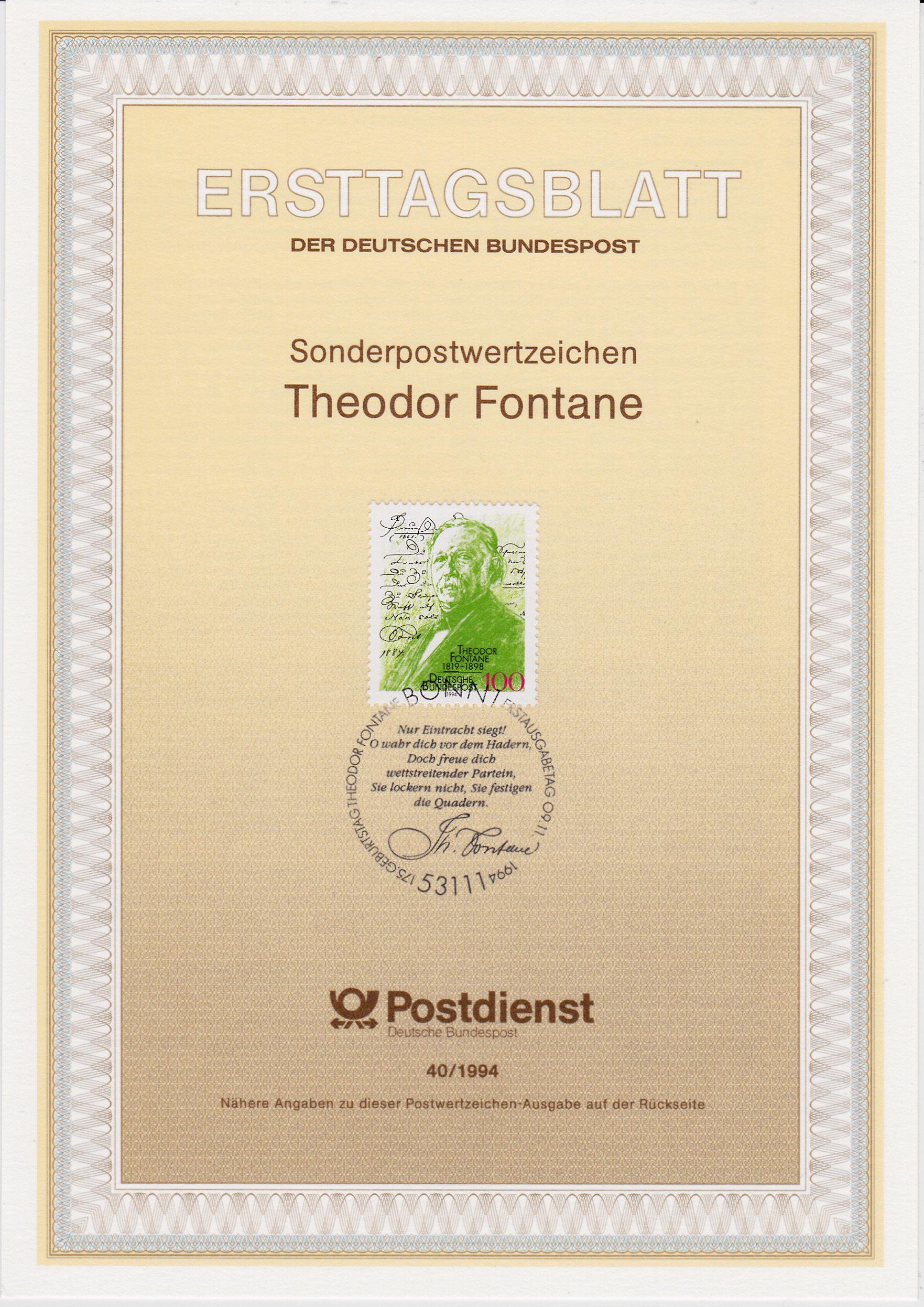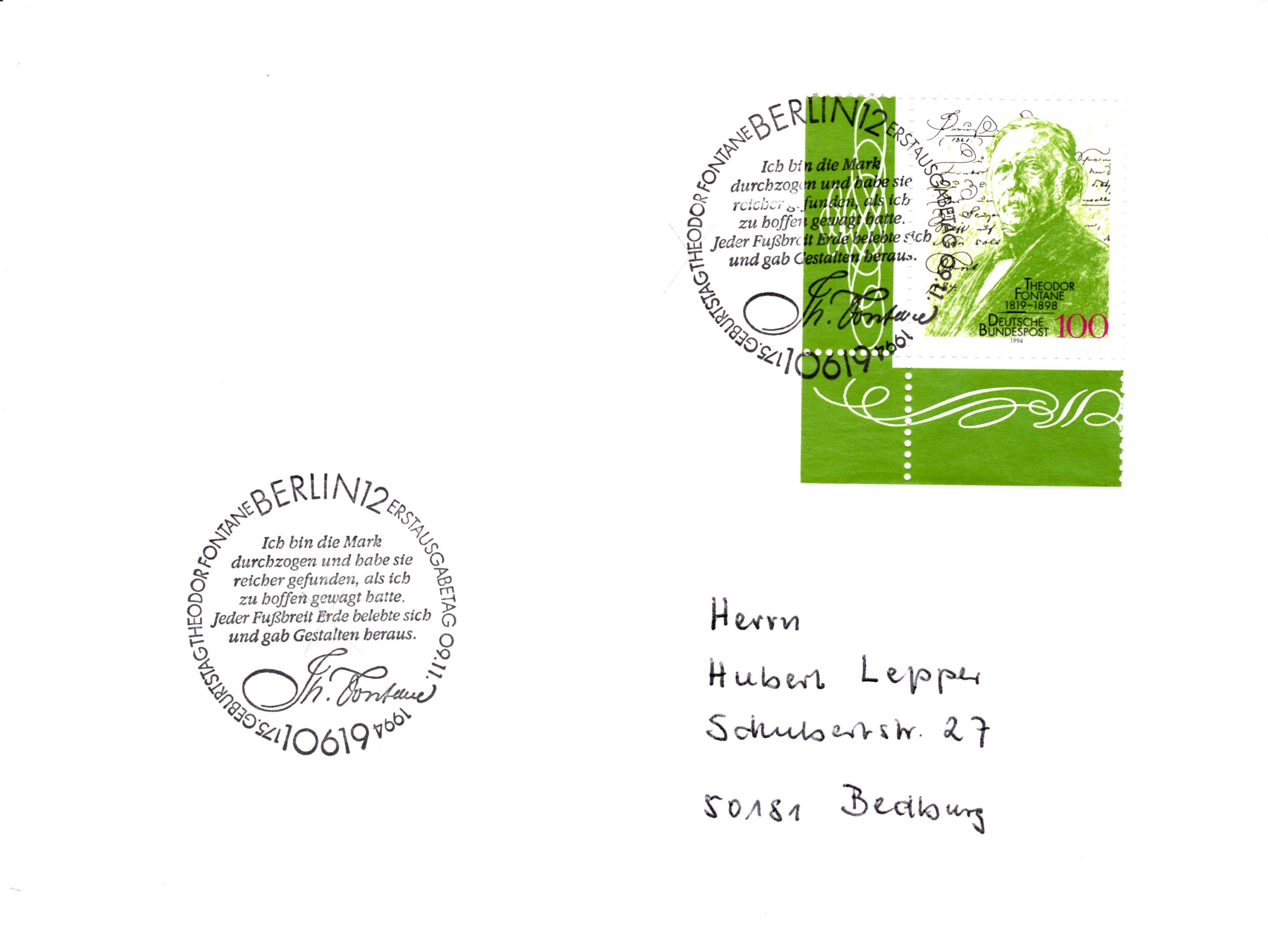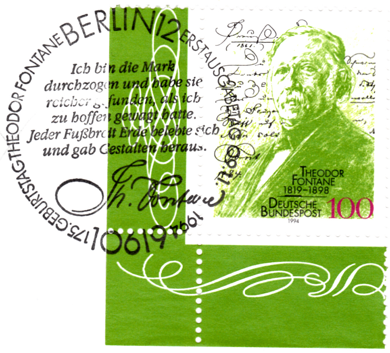 Fie im ersten Beitrag gezeigte Marke wurde hier mit dem Ersttagsonderstempel Bonn gestempelt. Im Stempelbild wird ein Text von Theodor Fontane zitiert mit seiner Unterschrift.