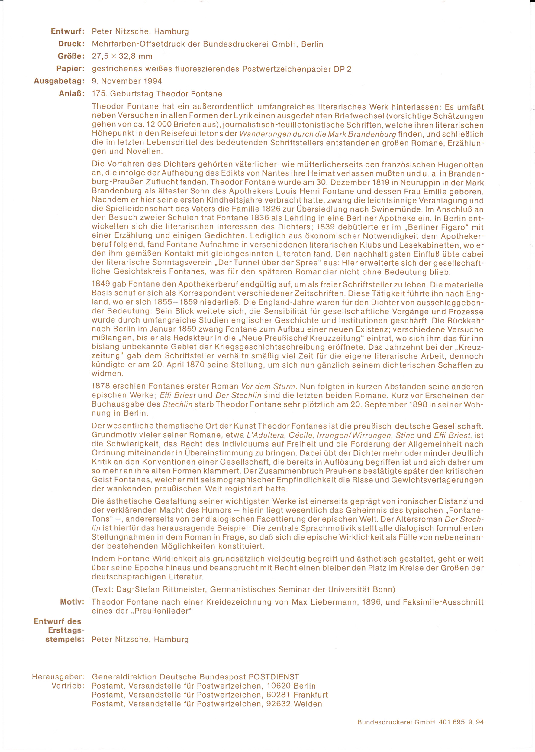 Zum 175.Geburtstag ist diese Marke (MiNr 1767) mit einem Porträt von Fontane nach einer Kreidezeichnung von Max Liebermann vor einem Ausschnitt aus einem seiner "Preußenlieder" erschienen.