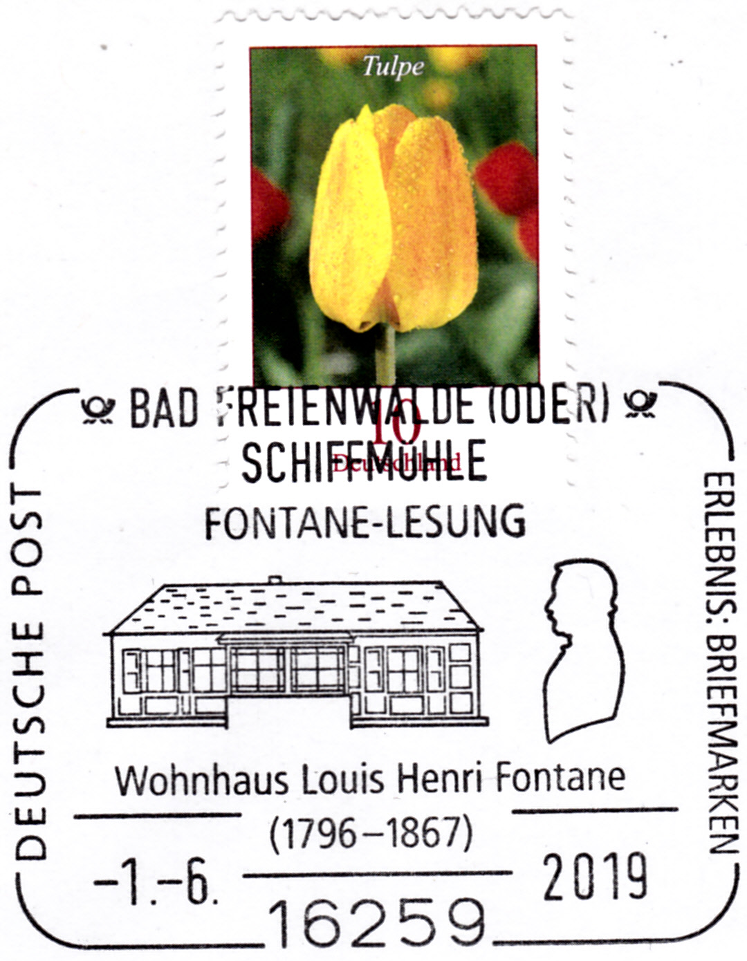 Dieser Sonderstempel aus Bad Freienwalde (Oder) zu einer Fontane-Lesung zeigt das Wohnhaus von Louis Henri Fontane in Schiffmühle (Ortsteil von Bad Freienwalde).