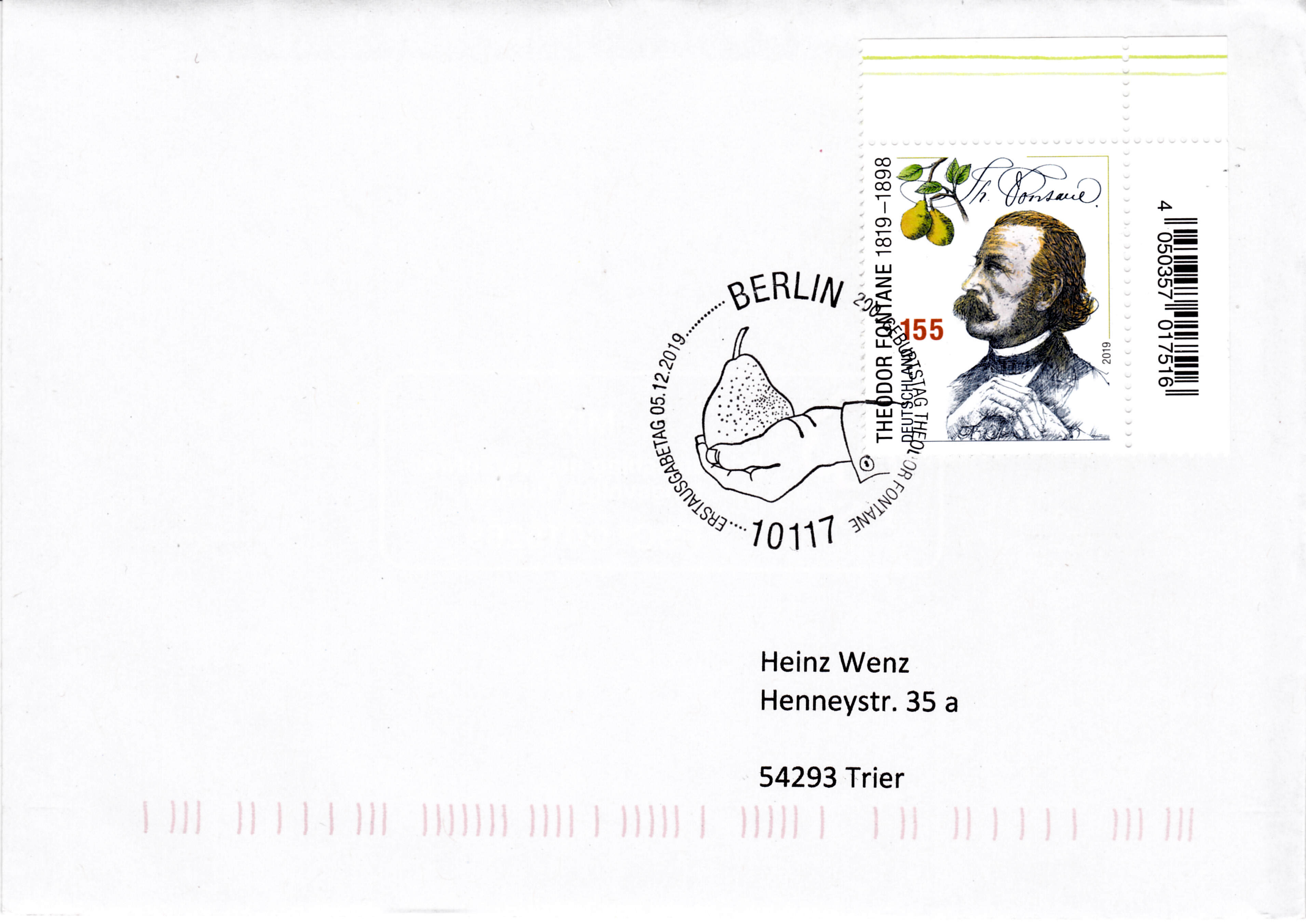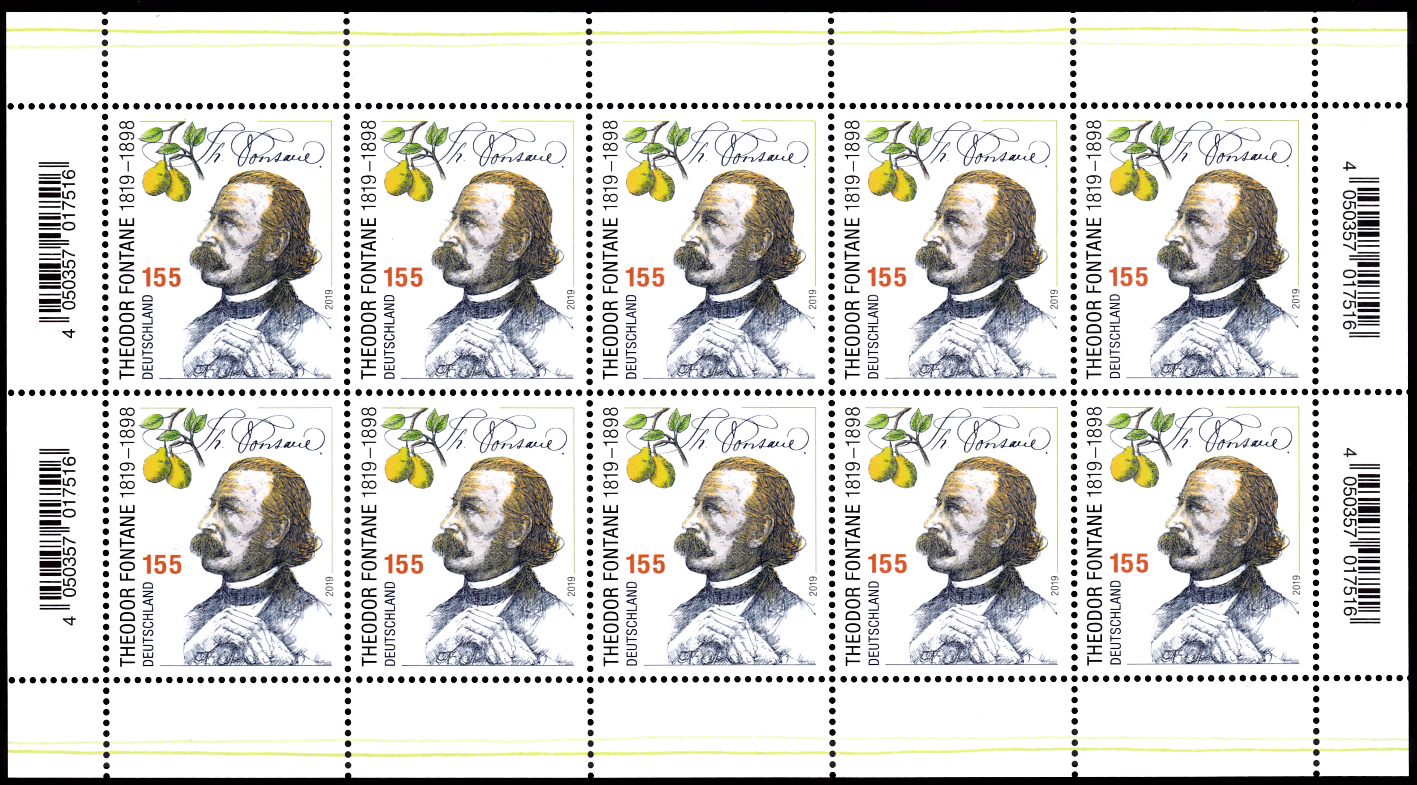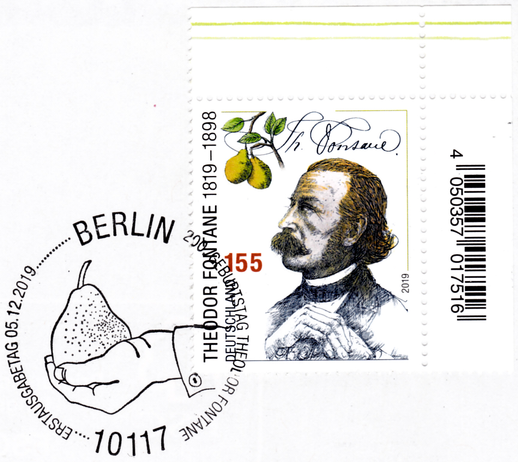 Zum 200. Geburtstag von Theodor Fontane ist bei der Deutschen Post eine weitere Marke (MiNr 3508) mit einem Porträt von Theodor Fontane erschienen. Hier zeige ich ein Eckrandstück mit EAN-Codierung.