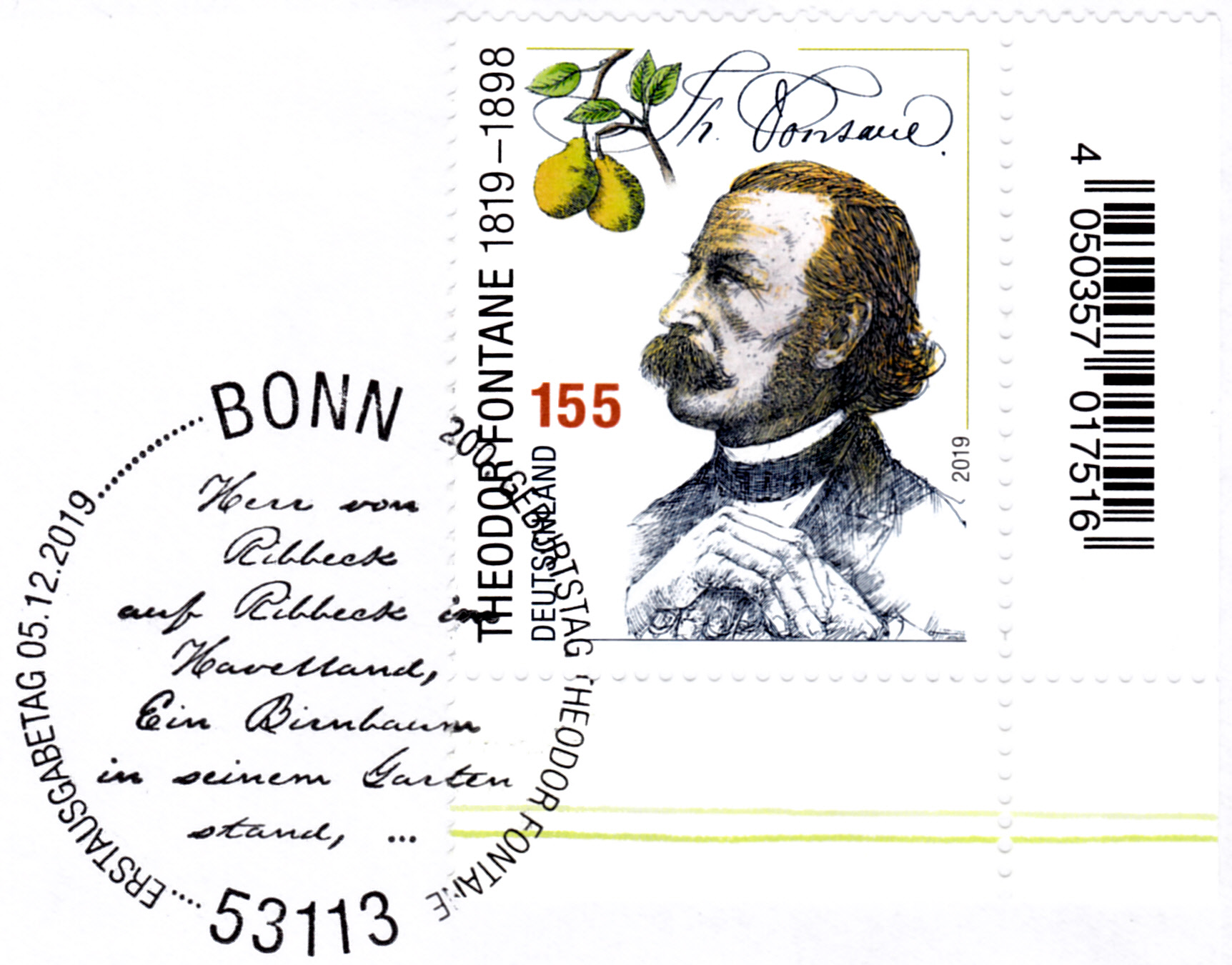 Die ersten Zeilen seiner Ballade "Herr von Ribbeck auf Ribbeck im Havelland" sind im Ersttagsonderstempel aus Bonn zu lesen.