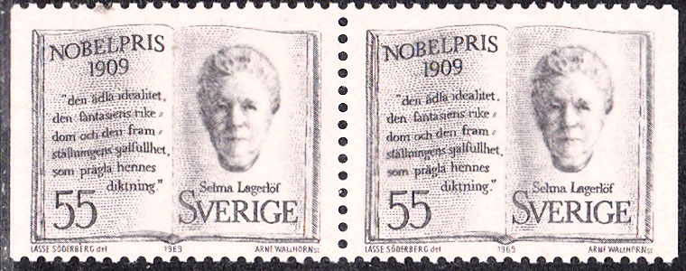 1969 erschien zum Jubiläum "60 Jahre Nobelpreisverleihung von 1909" in Schweden auch eine Marke mit Selma Lagerlöf, der Literatur-Nobelpreisträgerin von 1909. Hier ein waagerechtes Paar aus einem Markenheftchen (MiNr 663 Dl/663 Dr).