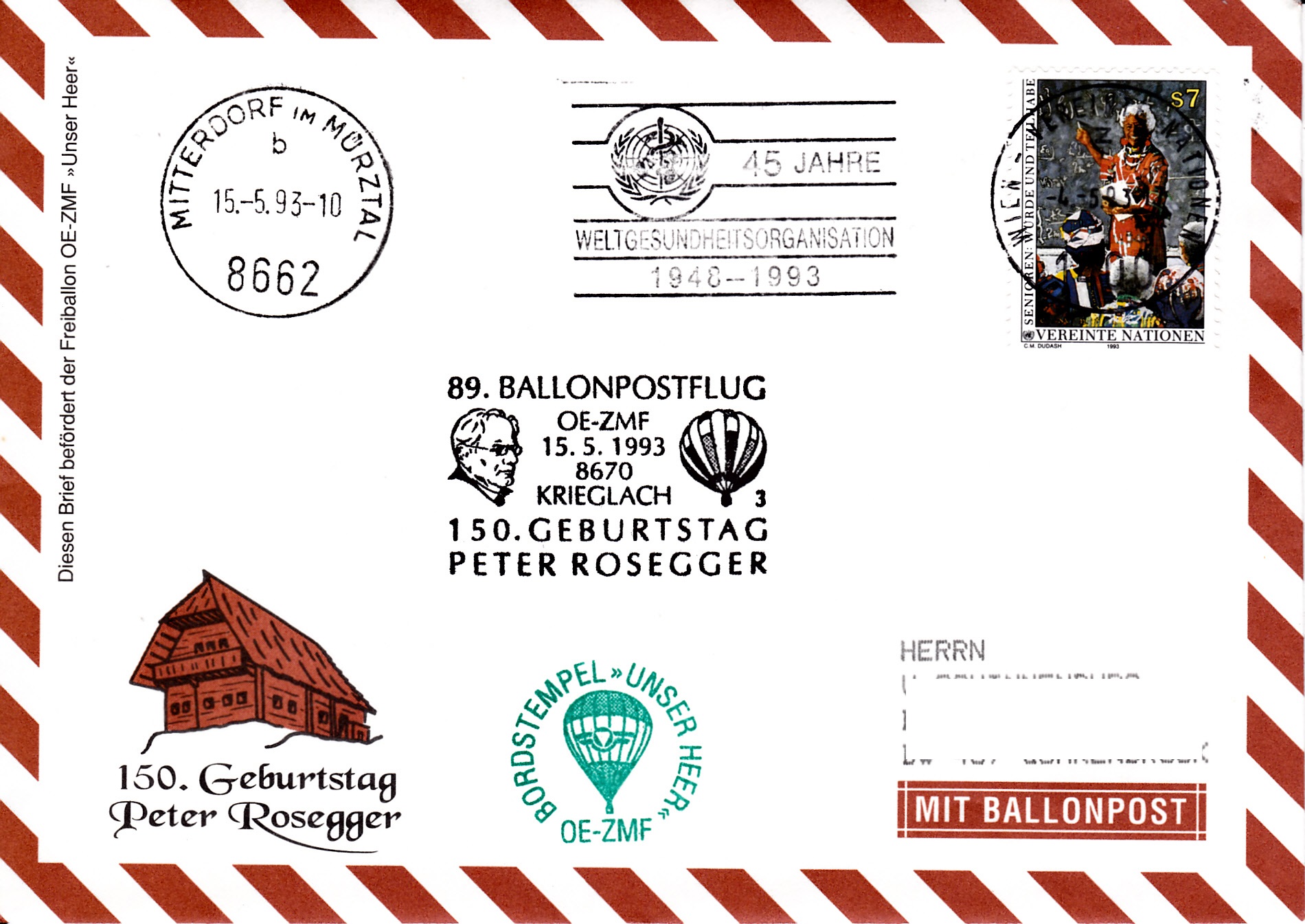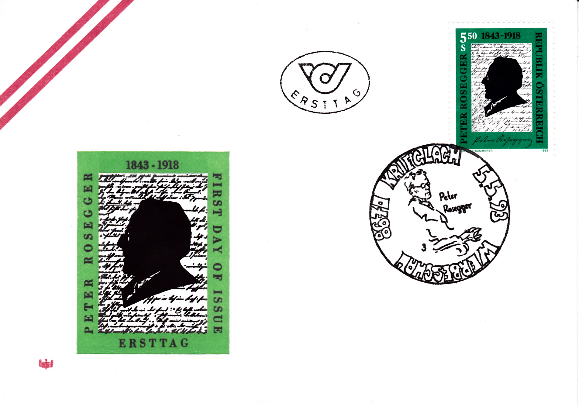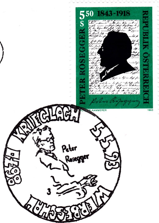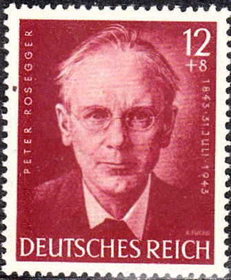 Zum 100. Geburtstag von Peter Rosegger ist im Deutschen Reich diese Marke (MiNr 856) mit seinem Porträt erschienen.