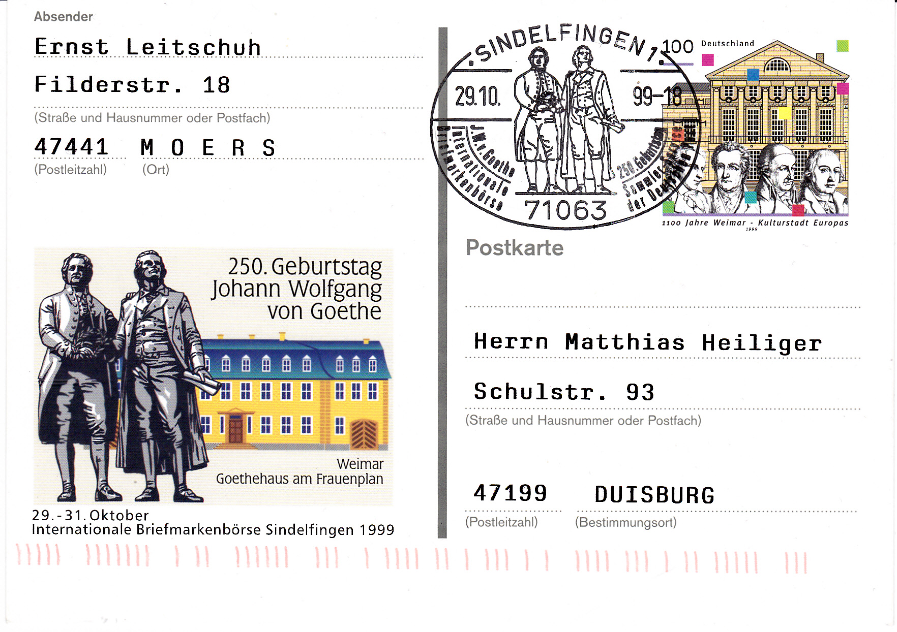 Sonderpostkarte zur Internationalen Briefmarkenbörse Sindelfingen 1999 (MiNr PSo 62) mit einem Wertstempel im Muster der im vorigen Beitrag gezeigten Marke "1100 Jahre Weimar" (MiNr 2028).