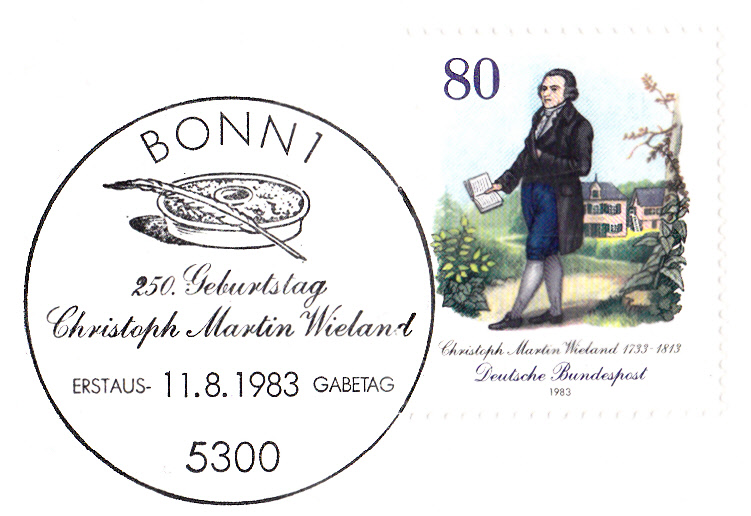 Zum 250. Geburtstag von Christoph Martin Wieland ist bei der Deutschen Bundespost diese Marke (MiNr 1183) mit einer Abbildung von Wieland erschienen.