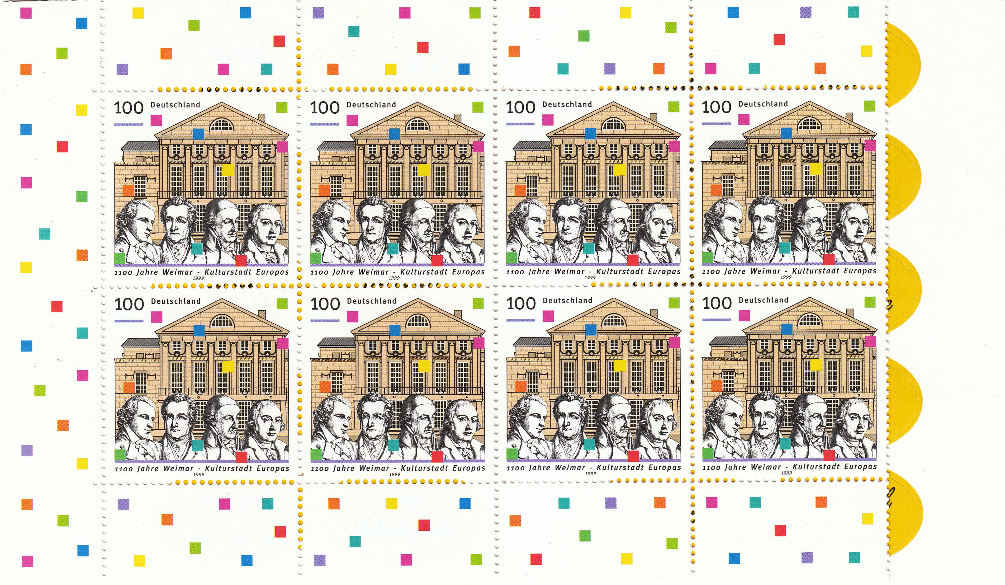 Zum Jubiläum "1100 Jahre Weimar - Kulturhauptstadt Europas 1999" erschien bei der Deutschen Post eine Sondermarke (MiNr 2028) mit den Porträts von (von links nach rechts) Friedrich von Schiller (1759-1805), Johann Wolfgang von Goethe (1749-1832), Christoph Martin Wieland (1733-1813) und Johann Gottfried von Herder (1744-1803), sowie der Abbildung der Fassade des Deutsches Nationaltheater in Weimar.