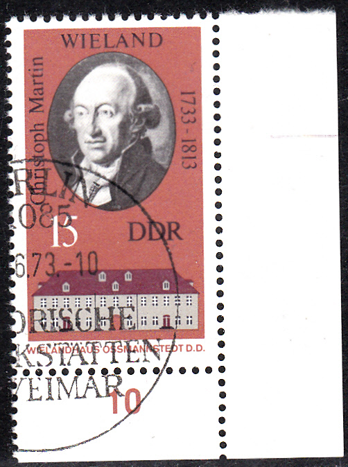 In der Serie "Historische Gedenkstätten in Weimar" erschien in der DDR 1973 auch eine Marke (MiNr 1857) mit einem Porträt von Martin Wieland. Hier eine Marke als Eckrandstück.