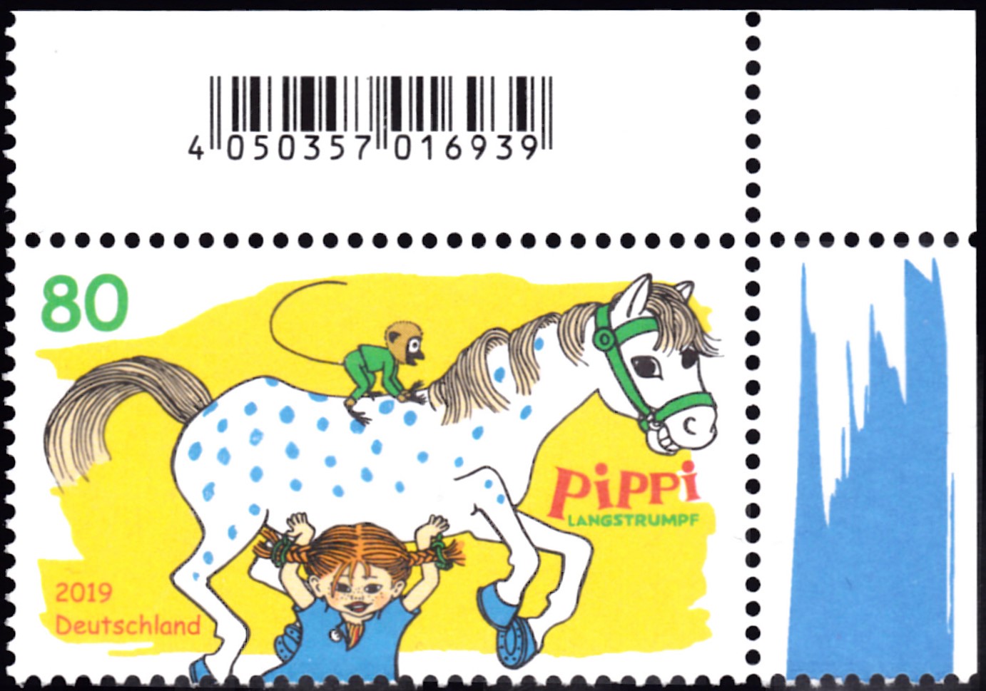 Bei der Deutschen Post ist eine weitere Marke (MiNr 3507) zum Kinderbuch "Pippi Langstrumpf" in der Serie "Helden der Kindheit" erschienen. Hier zeige ich ein Eckrandstück mit EAN-Codierung.