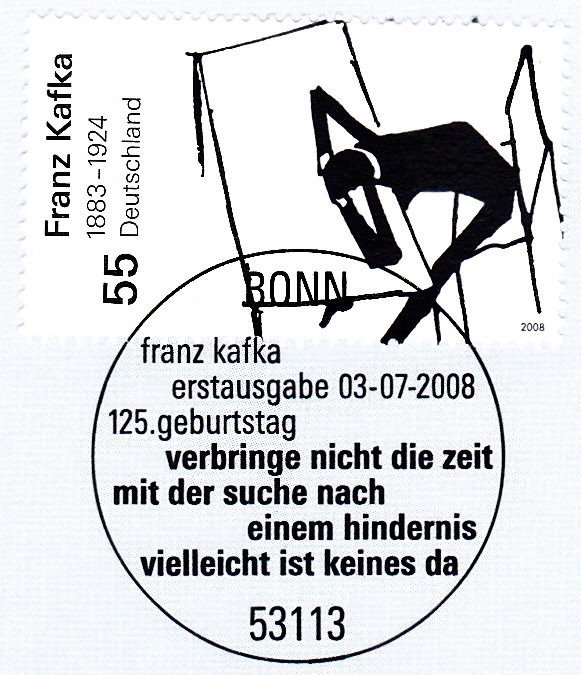 Auch im Ersttagsonderstempel aus Bonn zur Marke zum 125. Geburtstag von Franz Kafka wird ein Satz von Franz Kafka zitiert.