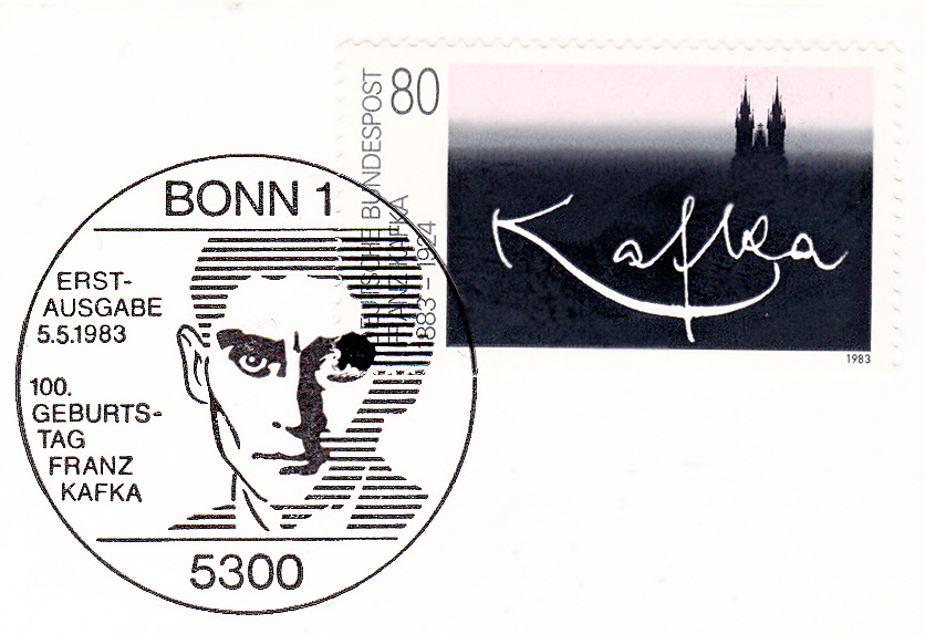 Eine Marke wurde hier mit dem Ersttagsonderstempel Bonn entwertet. Im Stempel wird ein Porträt von Franz Kafka gezeigt.