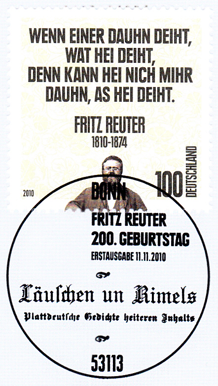 Zum 175. Geburtstag von Fritz Reuter erschien bei der Deutschen Bundespost eine Marke (MiNr 1263) mit seinem Porträt und einem Autograph.