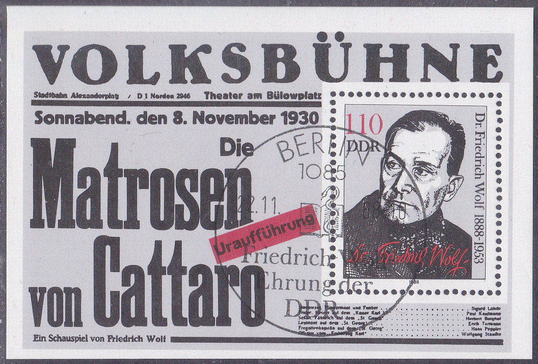 Zum 100. Geburtstag von Friedrich Wolf erschien in der DDR ein Block (MiNr Block 96 mit Marke MiNr 3213). Hier zeige ich einen Block mit dem Ersttagsonderstempel aus Berlin.