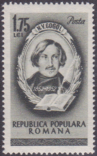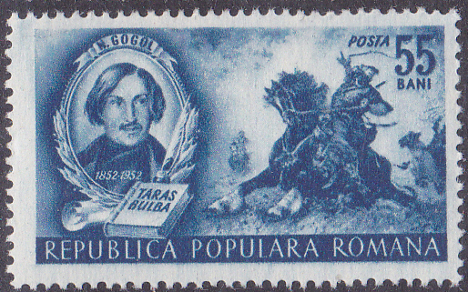 Diese Marke aus Rumänien (MiNr (1389) zum 100. Todestag von Nikolai Gogol zeigt ein Porträt von Gogol und eine Szene aus "Taras Bulba".